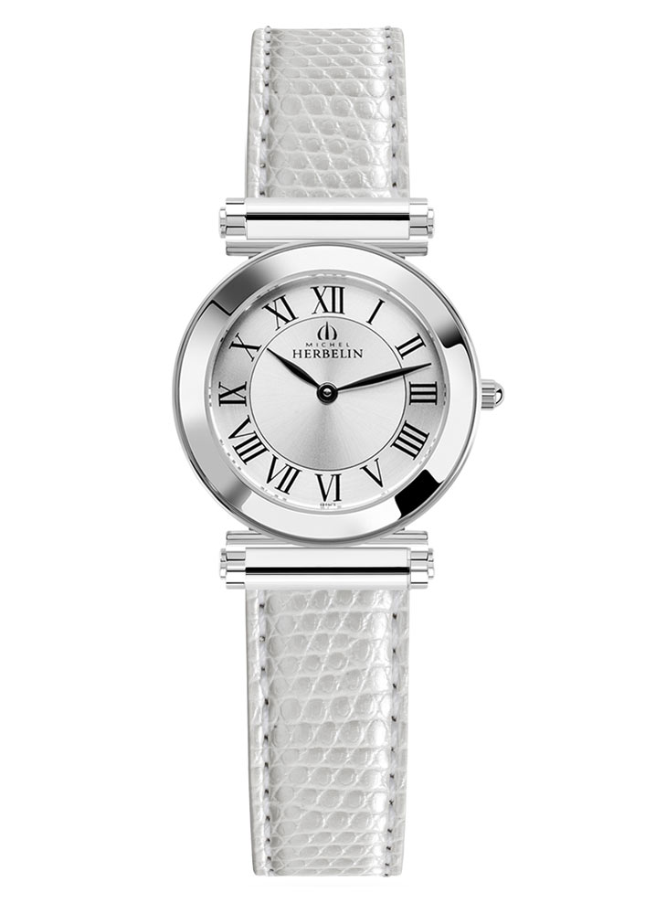 Francouzská značka Herbelin představuje dámské hodinky z kolekce Antares . Kolekce Antares se skládá z hodinek, které se mohou pochlubit vysokou estetikou a elegancí. Kulaté pouzdro o průměru 29 mm je vyrobeno z nerezové oceli. Pod safírovým sklíčkem, které se velmi těžko poškrábe, se nachází ciferník s římskými indexy. Nad ciferníkem jsou černé hroty ve tvaru špičatých lístků a logo značky Herbelin. Hodinky vypadají fenomenálně a potěší oko každého uživatele této časomíry. K pouzdru je připevněn bílý kožený řemínek s ještěrčím vzorem. Srdcem hodinek je quartzový strojek napájený baterií Ronda, který zajistí dlouhodobý a bezproblémový chod. Model Antares je elegantní nabídka, která bude ladit s oficiálním outfitem, ale nejenom.