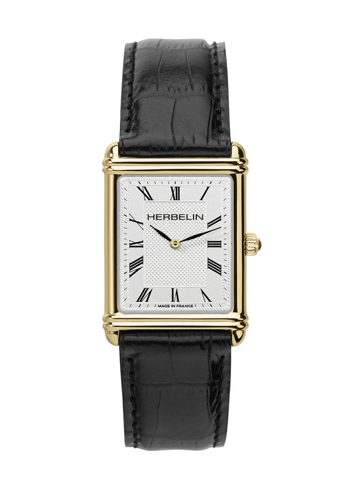 Čtvercové hodinky Herbelin Art Deco 17468P08 jsou vyrobeny z nerezové oceli o rozměru 26,50 mm x 32,20 mm. Pouzdro hodinek Herbelin se vyznačuje zlatou barvou, která hodinkám dodává moderní a exkluzivní vzhled a odolnost vůči korozi. Na očka hodinek je připevněn elegantní černý kožený řemínek. Jemně obepne každé jemné ženské zápěstí, což zajistí pohodlí při používání hodinek. Dvoubarevná barva v kombinaci s černým pruhem dodává celému projektu harmonii a kouzlo.