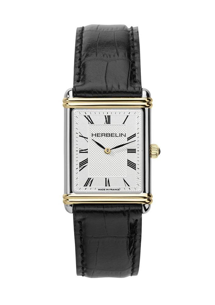 Hodinky Herbelin Art Deco 17468T08 jsou čtvercové dvoubarevné pouzdro vyrobené z nerezové oceli o rozměrech 26,50 mm x 32,20 mm. Pouzdro hodinek Herbelin se vyznačuje stříbrnou a zlatou barvou, která hodinkám dodává moderní a exkluzivní vzhled a odolnost vůči korozi. Na očka hodinek je připevněn elegantní černý kožený řemínek. Jemně obepne každé jemné ženské zápěstí, což zajistí pohodlí při používání hodinek. Dvoubarevná barva v kombinaci s černým pruhem dodává celému projektu harmonii a kouzlo.