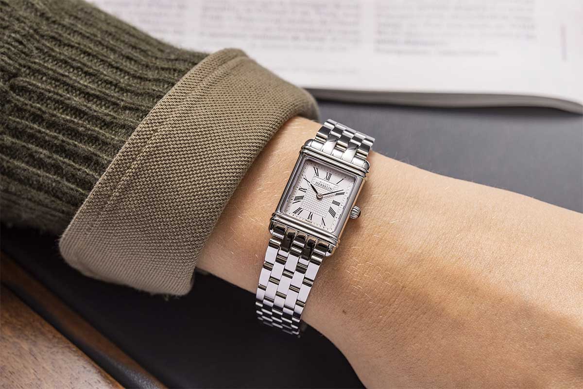Obdélníkové pouzdro o rozměrech 20,30 × 24,40 mm , charakteristické pro styl Art Déco, má také mnoho detailů, které jej činí jedinečným. V první řadě byl vyleštěn do vysokého lesku. Viditelná ražba kolem uší a vlnitá krajka zdobená modrým kamínkem zušlechťují její vzhled. Z horní strany je pouzdro uzavřeno safírovým sklem, které je odolnější proti poškrábání. Výrobce udával voděodolnost pouzdra 5 barů. Hodinky jsou zakončeny vysoce leštěným náramkem s hladkými ženskými křivkami.