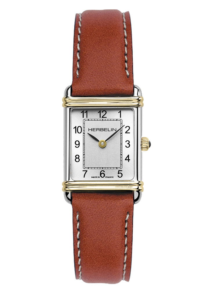 Elegantní dámské hodinky francouzské značky Herbelin Art Deco 17478T22GD v klasickém stylu. Obdélníkové pouzdro ve dvoubarevném stříbrno-zlatém provedení z nerezové oceli. Hnědý řemínek z pravé kůže s klasickým zapínáním na přezku. Sluncem broušený stříbrný ciferník s arabskými číslicemi je krytý tvrdým safírovým sklem. Srdcem hodinek je quartzový Machineek Ronda 751.