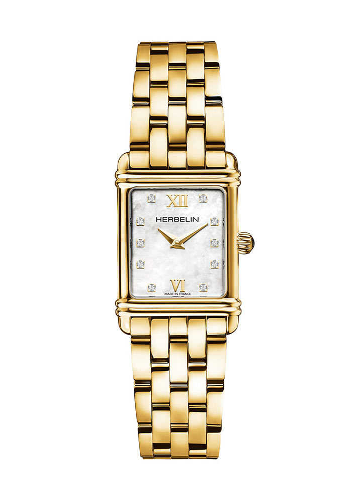 Hodinky Herbelin Art Deco 17478BP59 jsou obdélníkové pouzdro z nerezové oceli o velikosti 20 mm. Pouzdro hodinek Herbelin se vyznačuje zlatou barvou, která hodinkám dodává moderní a exkluzivní vzhled a odolnost vůči korozi. Na ouškoch hodinek je připevněn ocelový náramek s bezpečnou motýlkovou sponou. Obepne každé jemné ženské zápěstí, což zajistí pohodlí při používání hodinek. Zlatá barva pouzdra v kombinaci s náramkem dodává celému projektu harmonii a kouzlo.