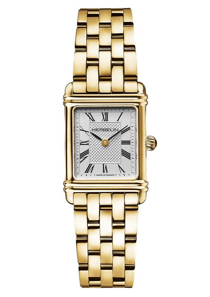 Dámské hodinky Herbelin Art Deco 17478BP08 jsou uzavřeny v obdélníkovém pouzdru z nerezové oceli zlaté barvy s PVD povlakem. Takové zdobení dodává celému projektu šperkový charakter a hodinky dokonale ladí se zlatými šperky. Rozměry pouzdra 20 × 24 mm a speciální zaoblené žebrování dodávají eleganci. Krásný náramek složený z drobných článků je vyleštěn do vysokého lesku. Pozoruhodný je zejména gilošovaný ciferník ve stříbrné barvě s jemným rámečkem uprostřed. Po obvodu lunety jsou římské číslice na celých hodinových bodech. Pod ciferníkem je quartzový Machineek. Švýcarský Machineek Ronda 751 je osvědčený systém, který zajistí dlouhou a přesnou práci hodinek. Mechanismus je napájen baterií.