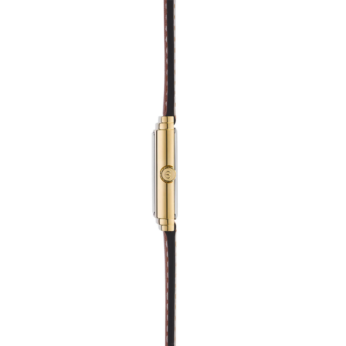 Pevné zlaté PVD pouzdro o rozměrech 29.50 mm x 22 mm je vyrobeno z odolné nerezové oceli, která zajišťuje odolnost proti poškození a zachovává si bezvadný vzhled po celá léta. Srdcem hodinek je švýcarský quartzový mechanismus Ronda, který zaručuje přesnost a spolehlivost. Stříbrný ciferník chráněný safírovým sklem kombinuje minimalistický design s čitelností a každý detail, od tenkých ručiček až po výrazné značení, zdůrazňuje řemeslné zpracování.