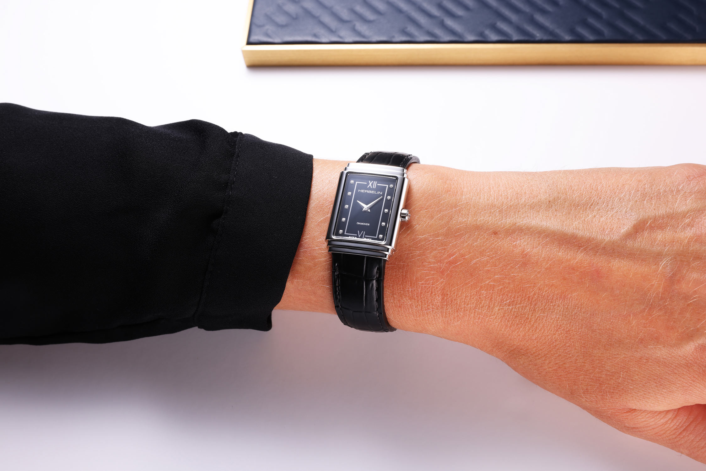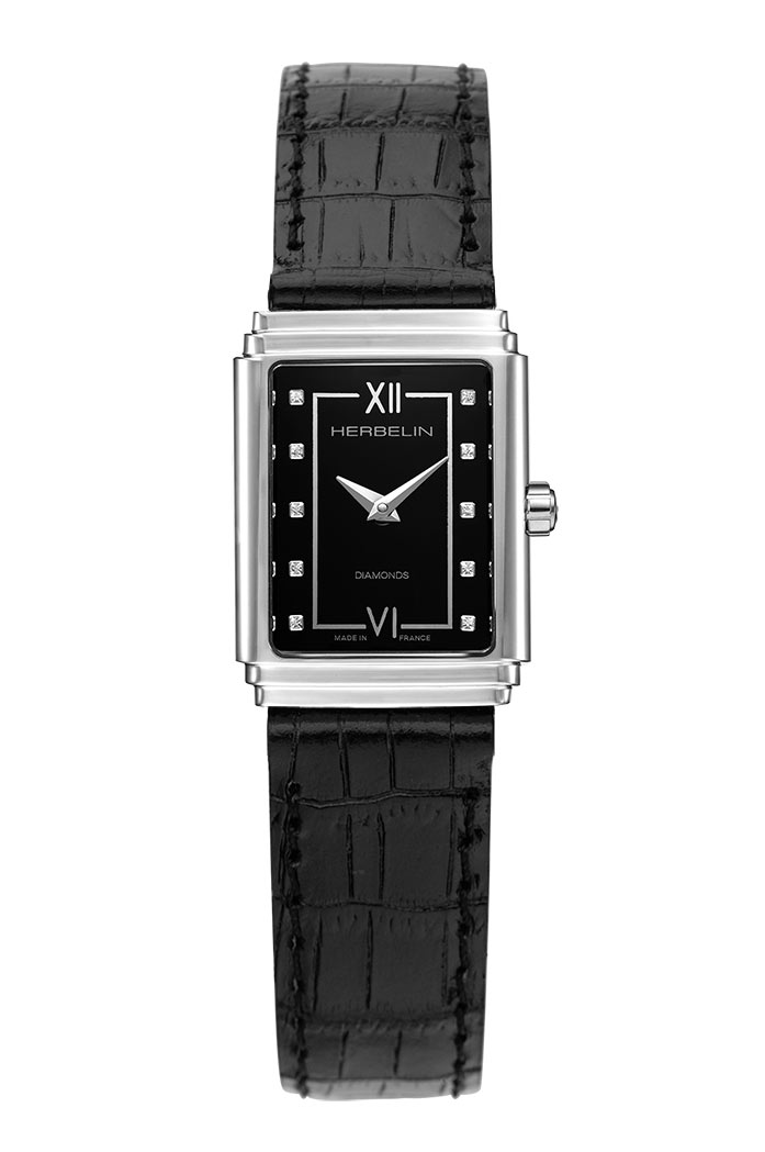 Obdélníkové pouzdro hodinek Herbelin z nerezové oceli září ve světle a zvýrazňuje každý detail propracovaného designu. Ciferník, zdobený jemnými diamantovými indexy, dodává modelu špetku glamouru a jedinečného charakteru. Hodinky jsou opatřeny safírovým sklem odolným proti poškrábání, což je činí ideálním společníkem pro každodenní nošení. Černý kožený řemínek, připomínající exotickou kůži, spojuje jemnost s elegancí a zaručuje maximální pohodlí, zatímco klasická spona poskytuje bezpečné a spolehlivé připevnění na zápěstí. Dámské hodinky Herbelin s diamanty jsou osazeny švýcarským quartzovým strojkem, který zajišťuje přesnost a spolehlivost.