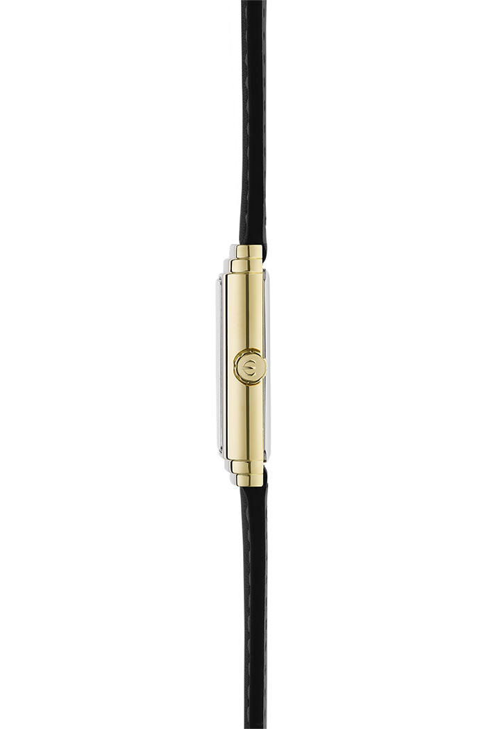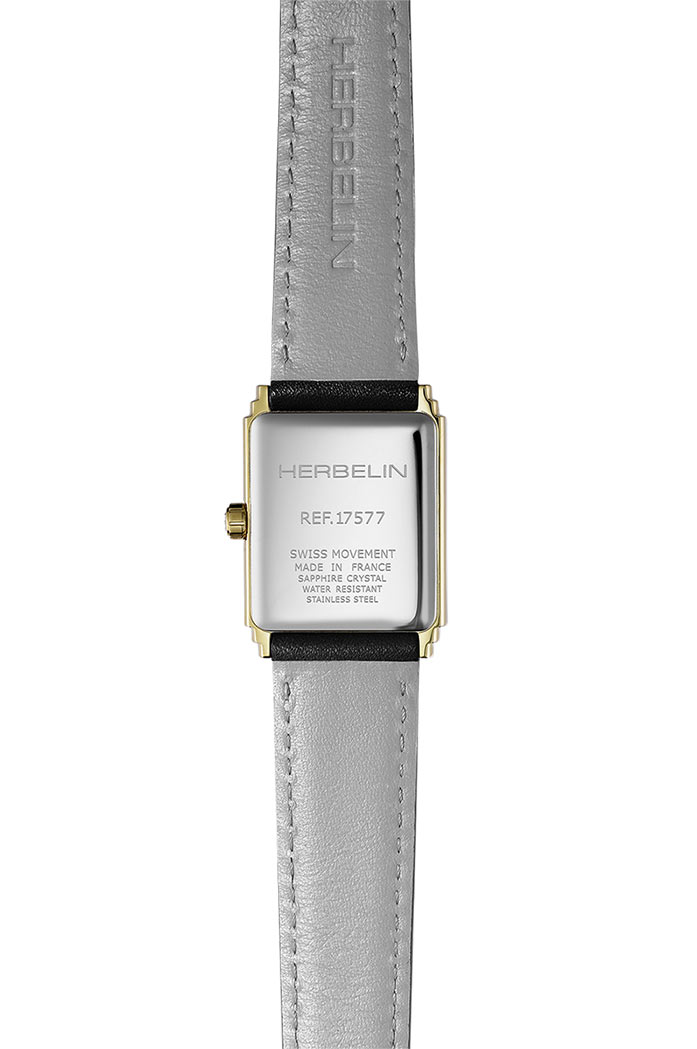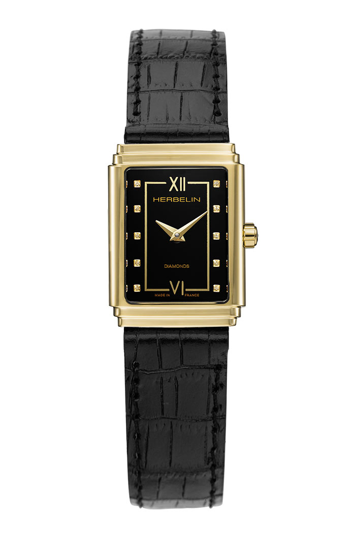 Obdélníkové pouzdro hodinek Herbelin z nerezové oceli se zlatou PVD vrstvou září ve světle a zvýrazňuje každý detail propracovaného designu. Ciferník, zdobený jemnými diamantovými indexy, dodává modelu špetku glamouru a jedinečného charakteru. Hodinky jsou opatřeny safírovým sklem odolným proti poškrábání, což je činí ideálním společníkem pro každodenní nošení. Černý kožený řemínek, připomínající exotickou kůži, spojuje jemnost s elegancí a zaručuje maximální pohodlí, zatímco klasická spona poskytuje bezpečné a spolehlivé připevnění na zápěstí. Dámské hodinky Herbelin s diamanty jsou osazeny švýcarským quartzovým strojkem, který zajišťuje přesnost a spolehlivost.