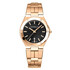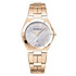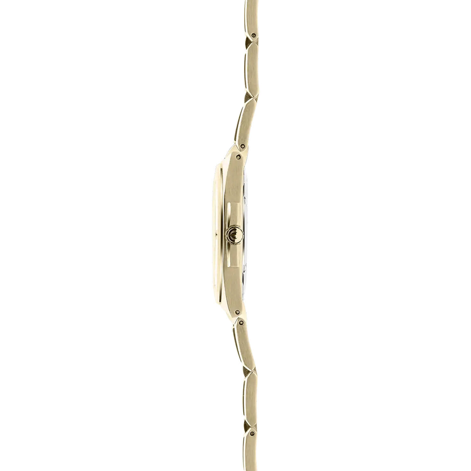 Elegantní kulaté pouzdro hodinek vyrobené z vysoce kvalitní nerezové oceli má průměr 33 mm a je vyrobeno z zlata PVD, které mu dodává subtilní, ale rafinovaný tvar. Šest ozdobných šroubů na lunetě dodává modelu luxusní charakter a podtrhuje jeho rafinovaný vzhled. Pozlacený náramek dokonale sladěný s pouzdrem zajišťuje nejen odolnost, ale i komfort nošení, a to díky motýlkové sponě, která zaručuje bezpečné a pohodlné používání. Tento model je vynikající volbou pro ženy, které hledají hodinky, které spojují každodenní funkčnost s elegancí. Jedinečný vizuální efekt dosažený kombinací leštěných a kartáčovaných povrchů pouzdra a náramku připomíná jemnou hru světla a stínu, odkazující na odrazy měsíce na klidné vodě, zdůrazňující přirozenou záři oceli.
