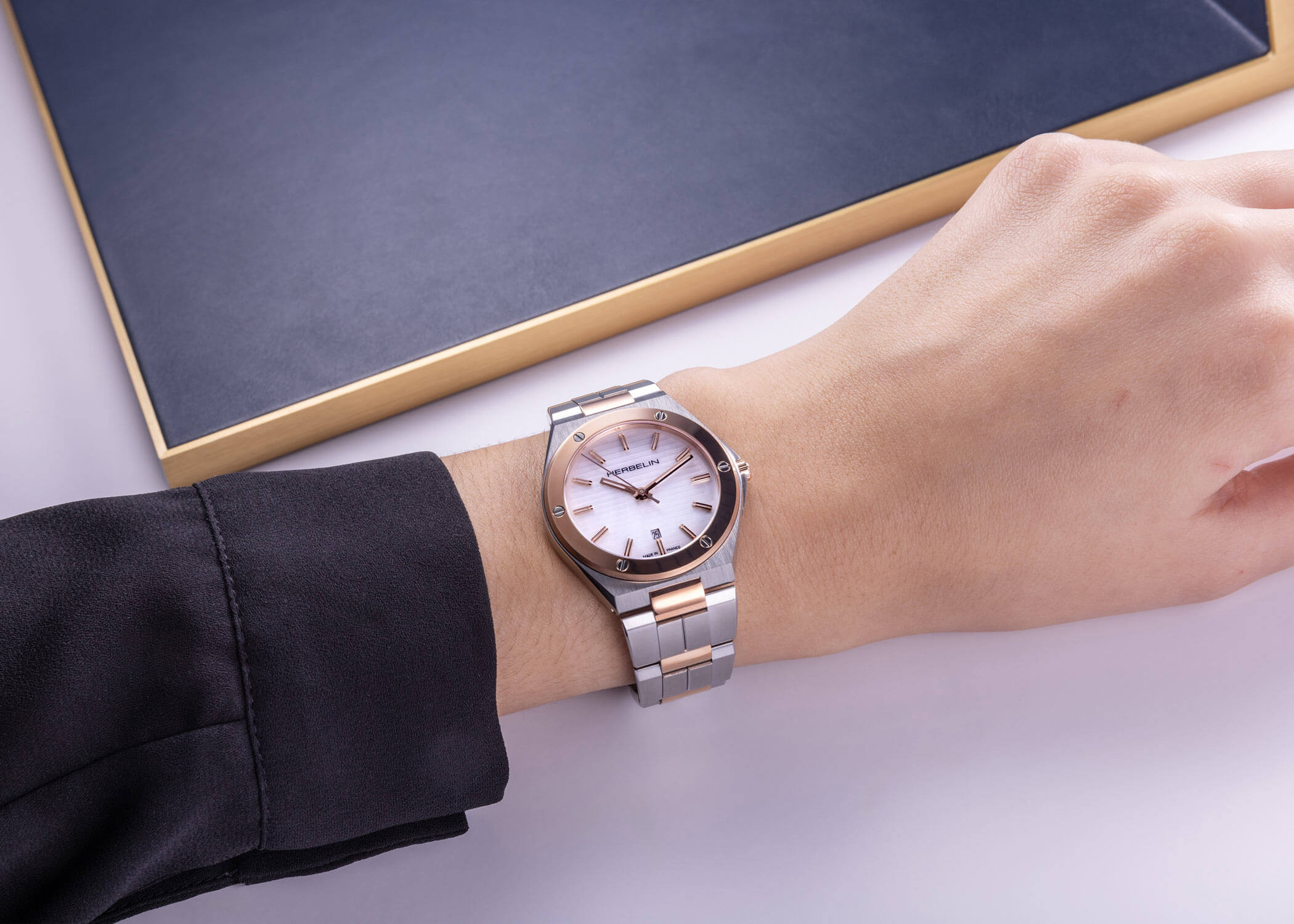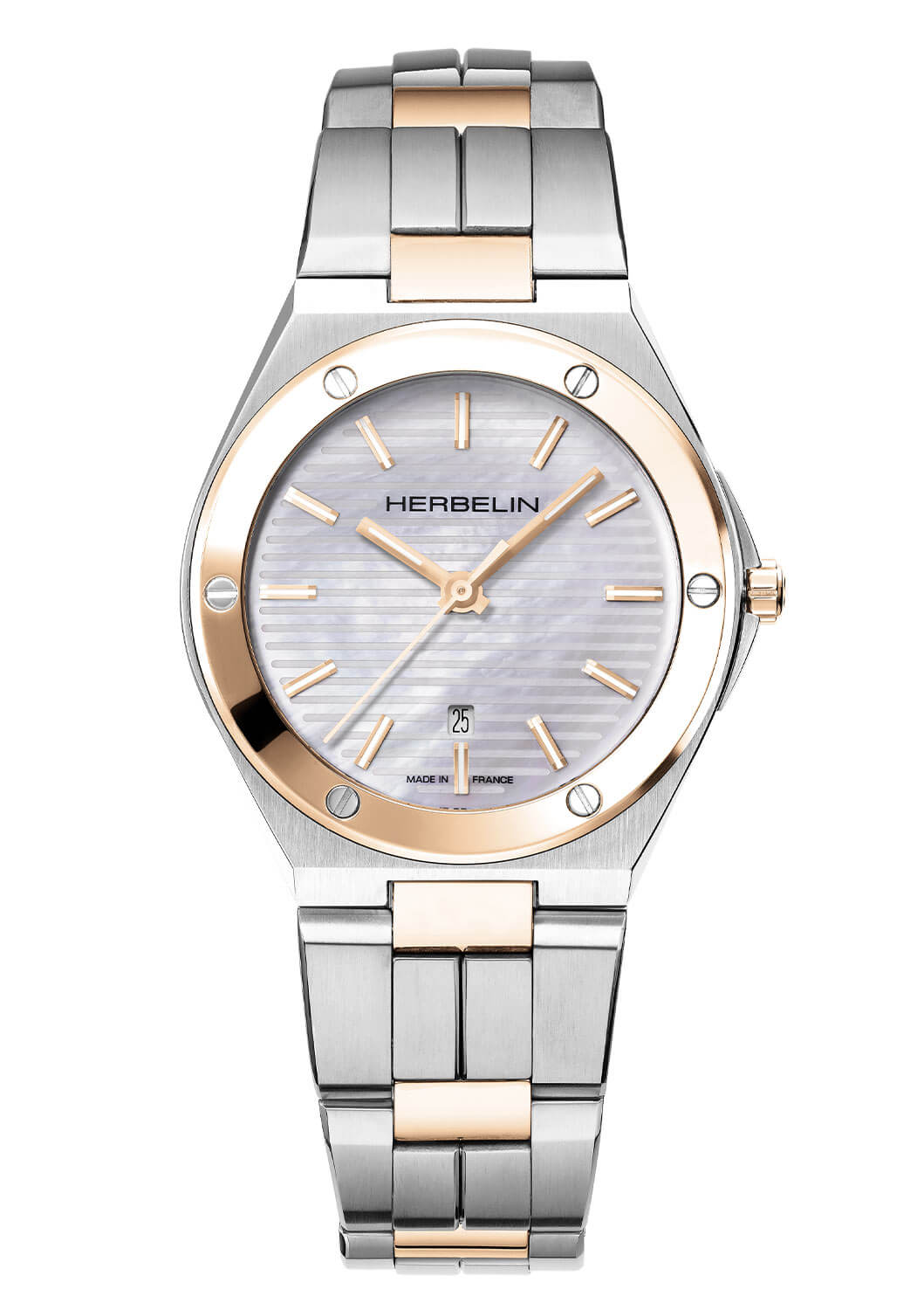 Bílý ciferník hodinek vyrobený z perleti připomíná zářící paprsky slunce v zenitu tohoto jihofrancouzského mysu. Luminiscenční značky hodin jemně napodobují třpyt měsíce a dodávají na pozadí perlového ciferníku dotek světla. Tento detail nejen zlepšuje čitelnost ve tmě, ale zároveň dává hodinkám poetický rozměr, který spojuje funkčnost s elegancí. Francouzské hodinky Herbelin 14545BTR19 ve stříbrné a zlaté barvě jsou navíc vybaveny diskrétním datumovým okénkem na 6. hodině a pohání je přesný švýcarský quartzový mechanismus, který zajišťuje spolehlivost a přesnost měření času.