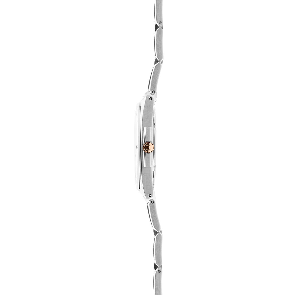 Elegantní kulaté pouzdro hodinek vyrobené z vysoce kvalitní nerezové oceli má průměr 33 mm a je k dispozici ve stříbrném a růžovém zlatě PVD, které mu dodává subtilní, ale rafinovaný tvar. Šest ozdobných šroubů na lunetě dodává modelu luxusní charakter a podtrhuje jeho rafinovaný vzhled. Pozlacený náramek dokonale sladěný s pouzdrem zajišťuje nejen odolnost, ale i komfort nošení, a to díky motýlkové sponě, která zaručuje bezpečné a pohodlné používání. Tento model je vynikající volbou pro ženy, které hledají hodinky, které spojují každodenní funkčnost s elegancí. Jedinečný vizuální efekt dosažený kombinací leštěných a kartáčovaných povrchů pouzdra a náramku připomíná jemnou hru světla a stínu, odkazující na odrazy měsíce na klidné vodě, zdůrazňující přirozenou záři oceli.