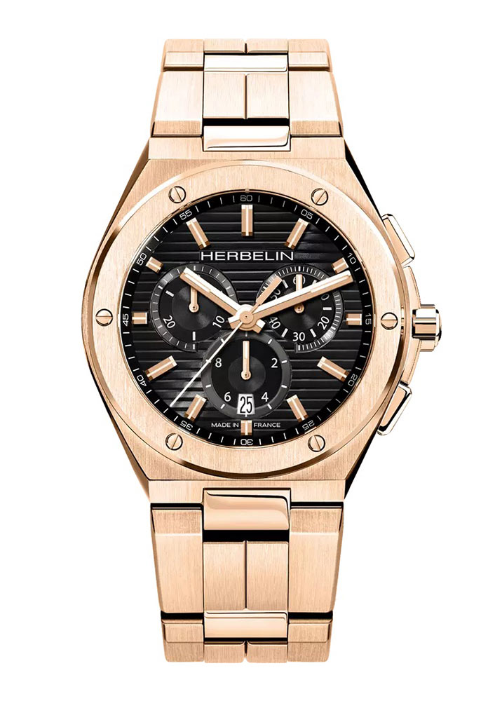 Pozlacené Herbelin Cap Camarat 37645BPR14 jsou extrémně funkční pánské hodinky ve stylu přímo ze 70. let. Inspirací pro kolekci Cap Camarat byl stejnojmenný mys, který nabízí krásný výhled na pláž Pampelonne, ležící nedaleko Saint-Tropez. Ocelové růžovo-zlaté pouzdro o průměru 42 mm je opatřeno kulatým kroužkem zdobeným šrouby. Jeho syrový styl dokonale zapadá do současných trendů. Výrobce se postaral i o vznešené provedení. Pozlacené pouzdro má vodotěsnost 100 metrů a celé pouzdro.