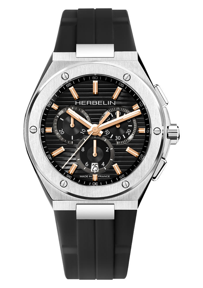 Francouzské pánské stopky Herbelin Cap Camarat Chronograph se vyznačují osobitým designem, který kombinuje sportovní a elegantní prvky. Jde o důstojný odkaz dlouhé tradice značky Herbelin, věrně odrážející původní styl ze 70. let. Zvláštní pozornost přitahuje horizontálně vyražený ciferník, připomínající vzor pruhované námořnické košile. Kontrastní indexy a ručky zdobené zlatem jsou inspirovány trupem lodi a díky luminiscenční výplni zajišťují čitelnost ve světlém i tmavém prostředí.