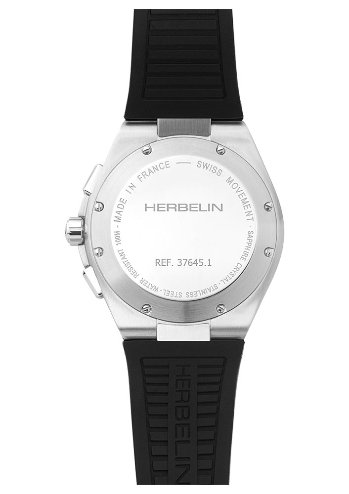 Pouzdro o průměru 42 mm s unikátní sadou šestišroubového rámu je vyrobeno z broušené nerezové oceli. Rámečky jsou obklopeny plochým safírovým sklem odolným proti poškrábání. V interiéru pánského modelu Herbelin Cap Camarat Chronograph 37645A14TR je umístěn švýcarský quartzový mechanismus, zajišťující funkci chronografu se třemi počítadly a datumovkou, která je umístěna v okénku na 6. hodině.Elegantní a sportovní charakter hodinek je zdůrazněno odolným páskem z vysoce kvalitní pryže FKM.