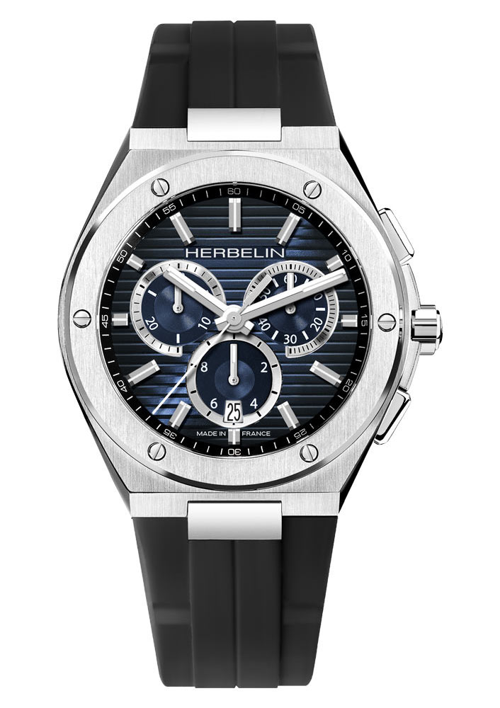 Francouzské pánské stopky Herbelin Cap Camarat Chronograph se vyznačují osobitým designem, který kombinuje sportovní a elegantní prvky. Jde o důstojný odkaz dlouhé tradice značky Herbelin, věrně odrážející původní styl ze 70. let. Zvláštní pozornost přitahuje horizontálně vyražený ciferník, připomínající vzor pruhované námořnické košile. Indexy a ručičky kontrastující s pozadím jsou inspirovány trupem lodi a díky luminiscenční výplni zajišťují čitelnost ve světlém i tmavém prostředí.
