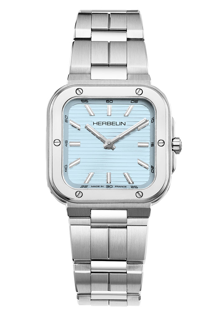 Hranaté hodinky Herbelin jsou na přední straně chráněny safírovým sklem odolným proti poškrábání. Kryje čtvercový, světle modrý štít se vzorem vodorovných pruhů. Aktuální čas ukazují velké ocelové ručičky a lineární indexy. Výrobce si dal záležet na snadném odečítání času za zhoršených světelných podmínek. Na ruce byla aplikována luminiscenční hmota. Hodinky jsou poháněny bateriovým quartzovým mechanismem.