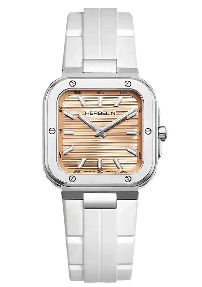 Za estetikou stojí i funkčnost. Hodinky jsou vybaveny přesným quartzovým strojkem, který zaručuje spolehlivost a pohodlí při každodenním nošení. Safírové sklíčko chrání ciferník před poškrábáním a luminiscenční ručky usnadňují čtení času i za šera — ideální řešení jak pro večeři při svíčkách, tak pro aktivní odpoledne na čerstvém vzduchu. Vodotěsnost na úrovni 100 metrů umožňuje nejen procházky po pláži, ale i plavání bez sundání hodinek. Ocelové dýnko připevněné šesti šrouby a robustní motýlkové zapínání integrované do bílého kaučukového řemínku zajišťují bezpečnost a komfort i v dynamických podmínkách. Herbelin zde nedělá kompromisy — tyto hodinky vypadají jako šperk, ale fungují jako špičkový sportovní nástroj.