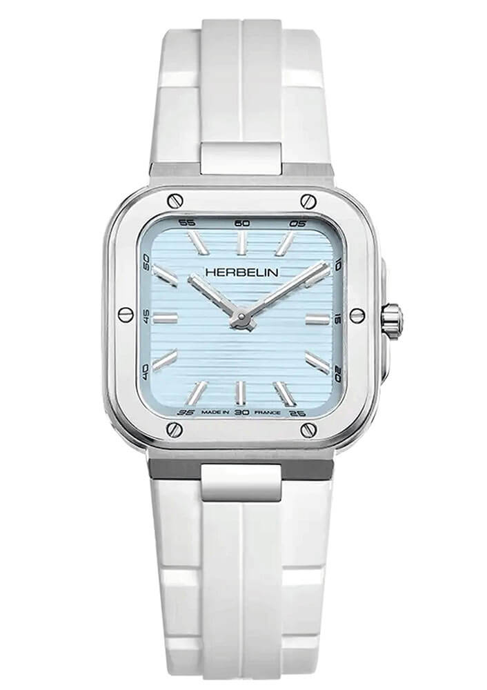 Dámské hodinky Herbelin Cap Camarat Lady Square 17546A25CW jsou harmonickým spojením francouzské estetiky a moderní odvahy ve formě. Geometrické pouzdro o rozměrech 30 x 30 mm nejen přitahuje pohledy, ale také boří stereotypy — ideální pro ženy, které si jdou vlastní cestou. Světle modrý ciferník s jemným horizontálním gilošováním evokuje mořský vánek z Azurového pobřeží — přímý odkaz na název kolekce inspirované francouzským letoviskem Cap Camarat. Design hodinek, přestože výrazný, nekřičí. Šeptá — elegantně, moderně a nenuceně.