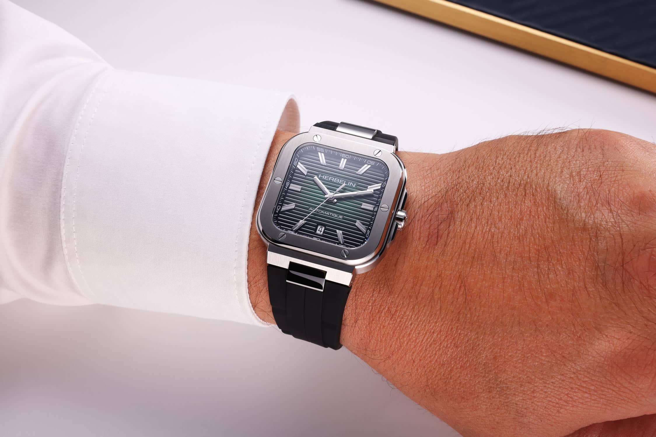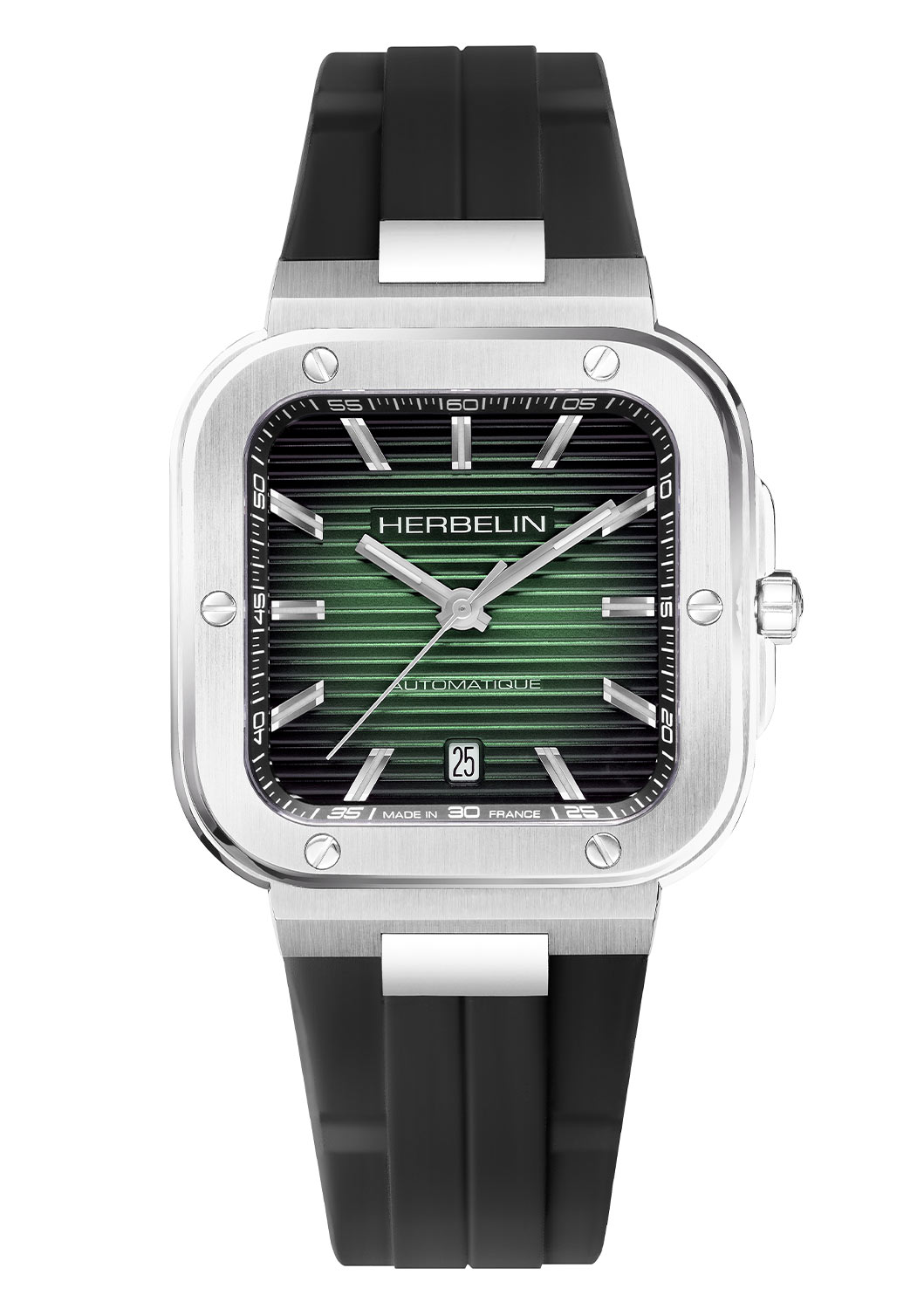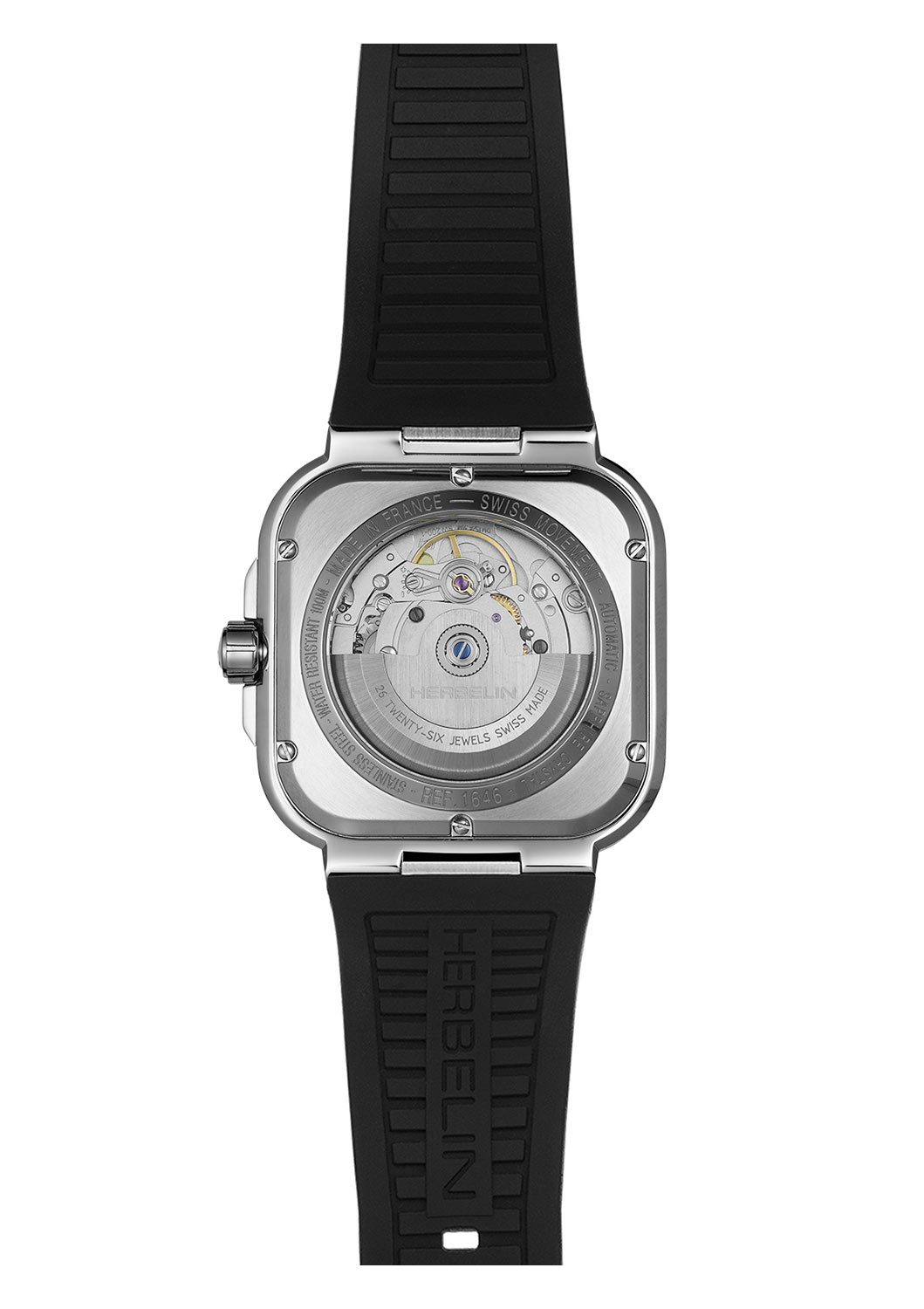 Hranaté hodinky Herbelin jsou na přední straně chráněny safírovým sklíčkem vysoce odolným proti poškrábání. Kryje čtvercový štít s výzdobou v podobě vodorovných pruhů. Aktuální čas ukazují velké ocelové ručičky a lineární indexy. Výrobce si dal záležet na snadném odečítání času za zhoršených světelných podmínek. Na ručičky a indexy byla aplikována luminiscenční hmota. Šest hodin je vyhrazeno pro datumové okno. Okno se světlým pozadím zobrazuje aktuální den v měsíci. Pod ciferníkem je instalován švýcarský automatický strojek, který je poháněn pohybem zápěstí. Sellita SW200 je oblíbený, osvědčený a precizní mechanismus, který svého majitele nezklame. Nabízí rezervu chodu přibližně 40 hodin a jeho chod lze sledovat díky průhlednému krytu na zadní straně pouzdra.