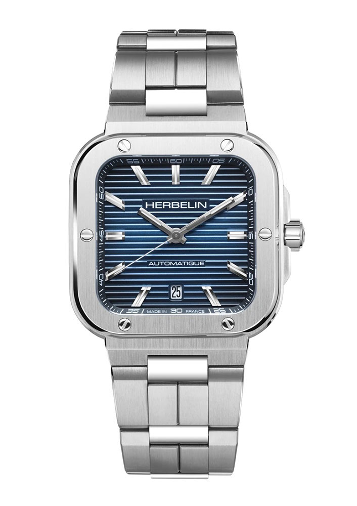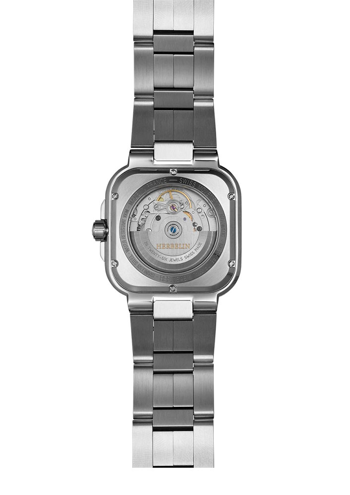 Hranaté hodinky Herbelin jsou na přední straně chráněny safírovým sklíčkem vysoce odolným proti poškrábání. Kryje čtvercový, modrý štít s výzdobou v podobě vodorovných pruhů. Aktuální čas ukazují velké ocelové ručičky a lineární indexy. Výrobce si dal záležet na snadném odečítání času za zhoršených světelných podmínek. Na ručičky a indexy byla aplikována luminiscenční hmota. Šest hodin je vyhrazeno pro datumové okno. Okno se světlým pozadím zobrazuje aktuální den v měsíci. Pod ciferníkem je instalován švýcarský automatický strojek, který je poháněn pohybem zápěstí. Sellita SW200 je oblíbený, osvědčený a precizní mechanismus, který svého majitele nezklame. Nabízí rezervu chodu přibližně 40 hodin a jeho chod lze sledovat díky průhlednému krytu na zadní straně pouzdra.
