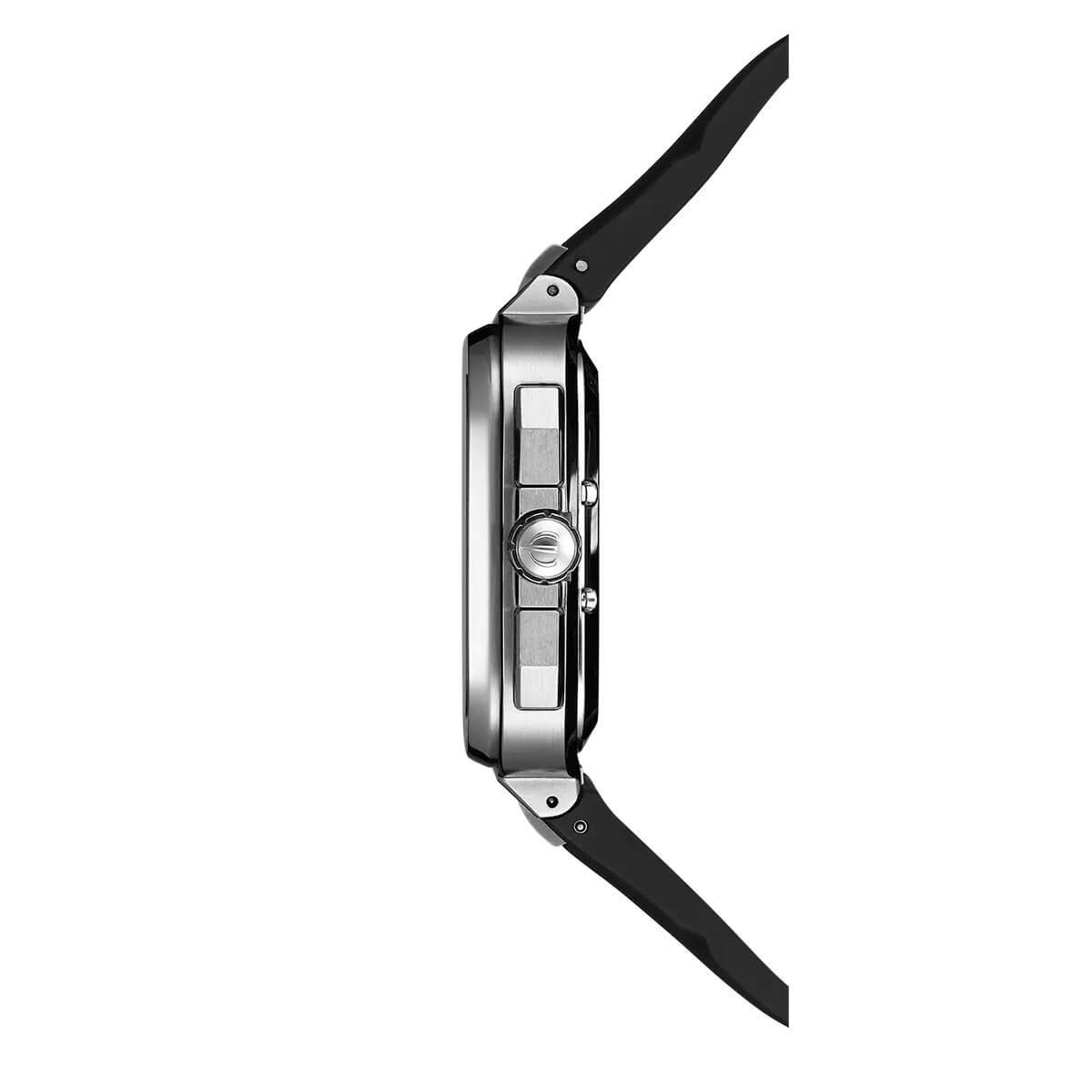 Nerezové pouzdro o rozměrech 40.50 x 40.50 mm je harmonickým spojením odolnosti a estetiky. Vybaven safírovým sklem odolným proti poškrábání poskytuje nejen vysokou ochranu, ale také vynikající viditelnost. Na pravé straně pouzdra jsou tlačítka pro manipulaci se stopkami a snadno ovladatelná korunka. Pryžový pásek FKM, známý svou odolností vůči stárnutí a extrémním podmínkám, zaručuje bezkonkurenční pohodlí při používání a odolnost. Jejich integrace s pouzdrem zdůrazňuje sportovní charakter hodinek a desetiletá záruka dokazuje nejvyšší kvalitu zpracování.