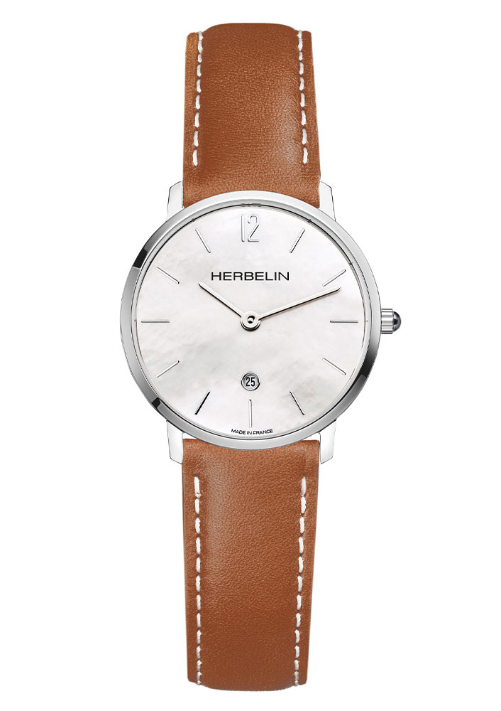 Francouzské dámské hodinky Herbelin City 16915AP19GD určené k nošení při jakékoli příležitosti. Kulaté pouzdro z nerezové oceli stříbrné barvy. Hnědý kožený řemínek s klasickým zapínáním na přezku. Jasný perleťový ciferník s lineárními indexy a arabskými číslicemi s přidáním funkce data na pozici šesté hodiny. Safírové sklíčko extrémně odolné proti poškrábání chrání ciferník před poškozením.