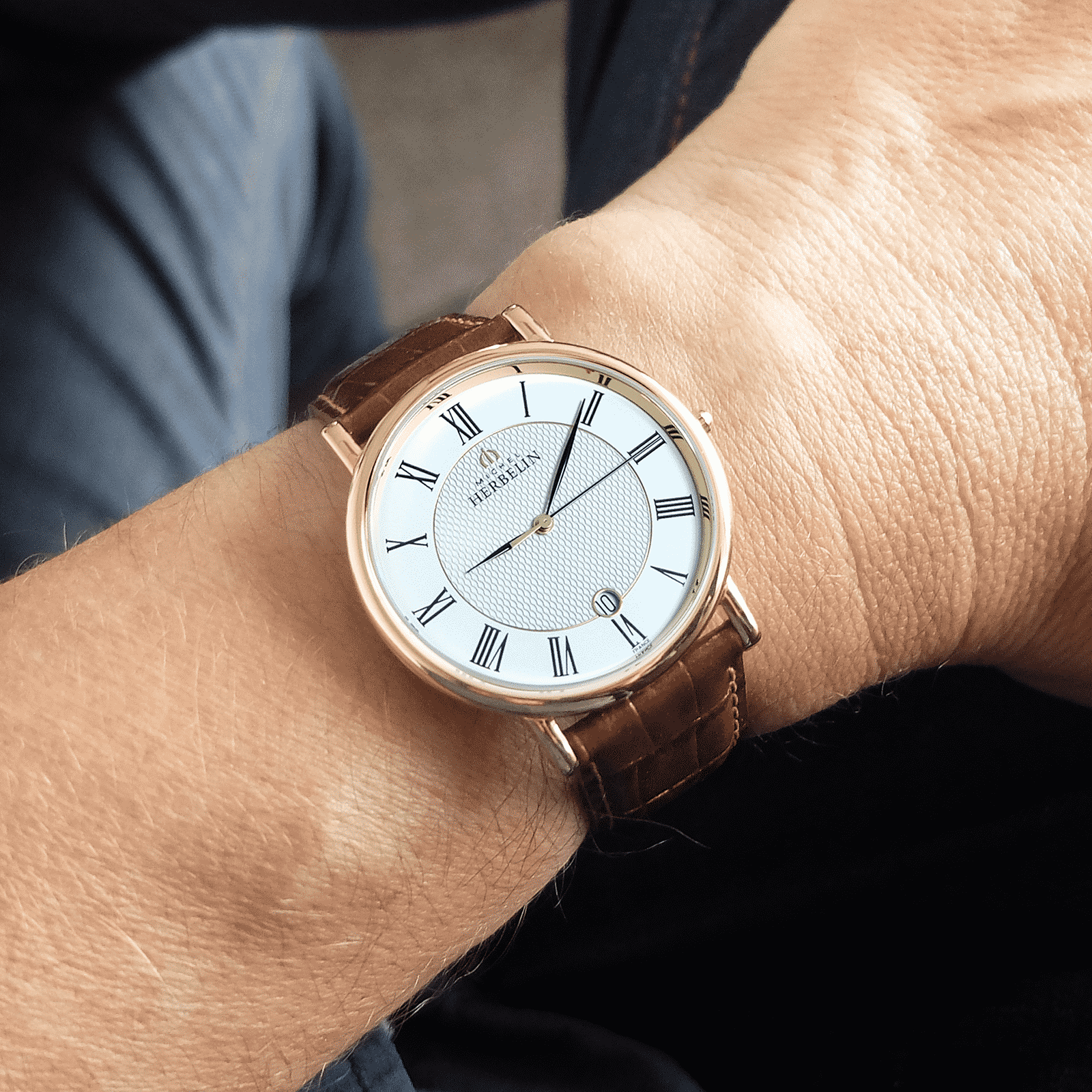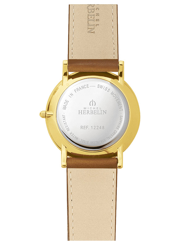 Pánské hodinky Herbelin Classique 12248P08MA. Kulaté pozlacené pouzdro z nerezové oceli. Hnědý kožený řemínek se zapínáním na přezku. Safírové sklo chrání bílý gilošovaný ciferník s římskými číslicemi a datumovkou na 6. hodině.