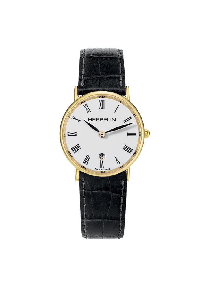 Dámské hodinky francouzské značky Herbelin Classique 16845P01. Kulaté pozlacené pouzdro z nerezové oceli. Černý řemínek z pravé kůže se zapínáním na přezku. Bílý ciferník s římskými číslicemi a datumovkou na 6. hodině.