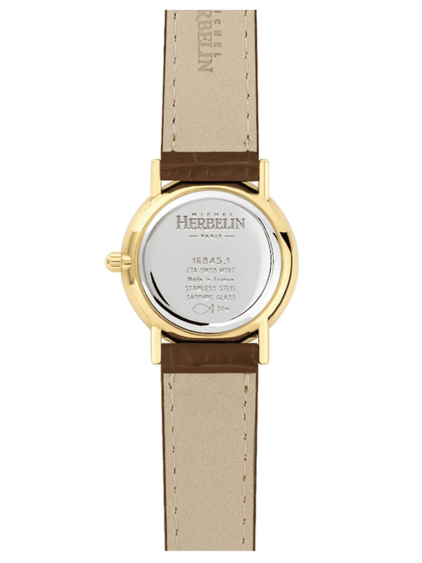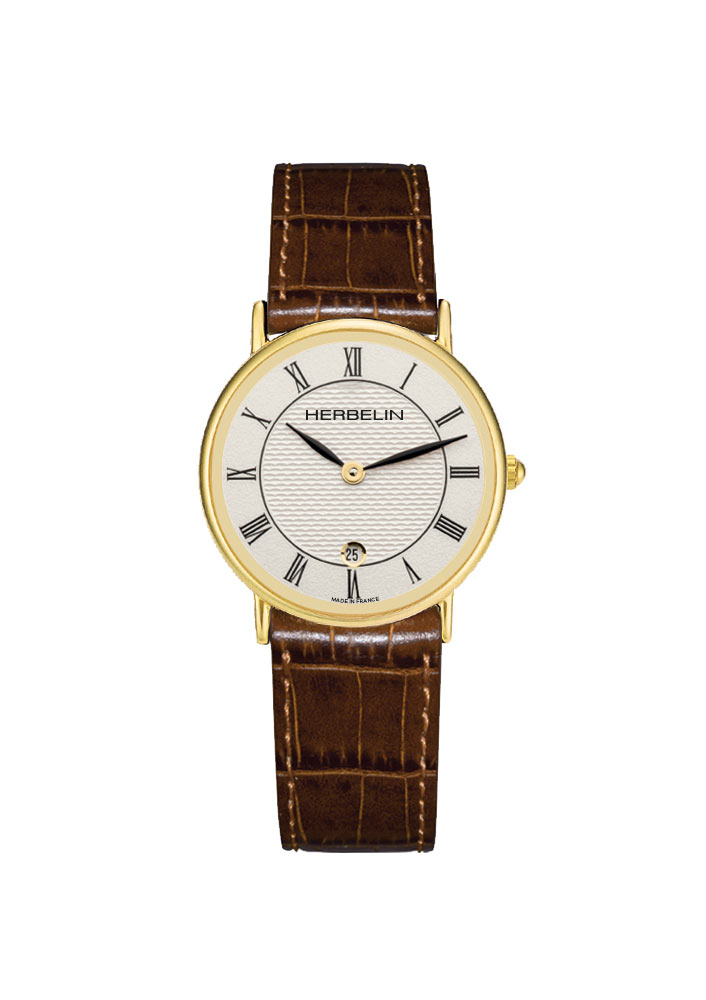 Dámské hodinky francouzské značky Herbelin Classique 16845P08MA. Kulaté pozlacené pouzdro z nerezové oceli. Hnědý kožený řemínek se zapínáním na přezku. Bílý ciferník s římskými číslicemi a datumovkou na 6. hodině je krytý tvrdým safírovým sklem.