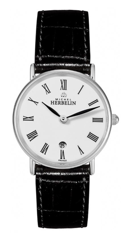 Klasické dámské hodinky francouzské značky Herbelin Classique 16845AP01. Kulaté pouzdro o průměru 26 mm vyrobené z nerezové oceli. Černý řemínek z pravé kůže s klasickým zapínáním na přezku. Bílý analogový ciferník s římskými číslicemi a datumovkou na 6. hodině, to vše zakryté safírovým sklem.