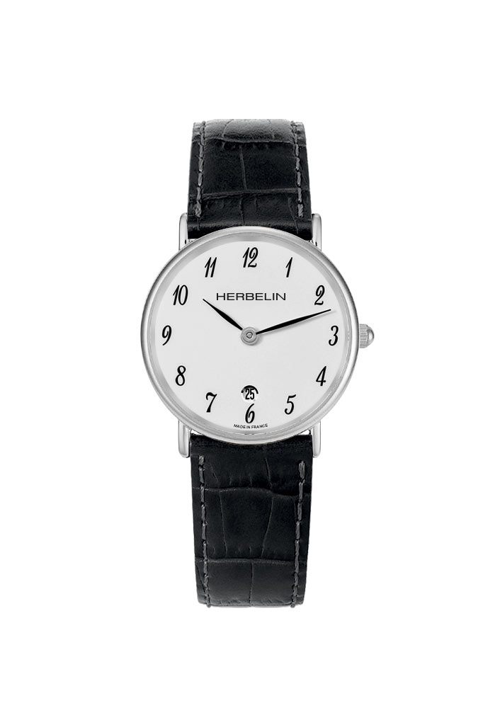 Klasické dámské hodinky francouzské značky Herbelin Classique 16845AP28. Kulaté pouzdro o průměru 26 mm vyrobené z nerezové oceli. Černý řemínek z pravé kůže s klasickým zapínáním na přezku. Bílý analogový ciferník s arabskými číslicemi a datumovkou na pozici šest hodin je krytý safírovým sklem.