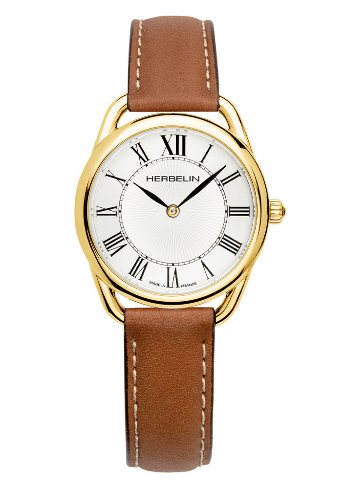 Elegantní dámské hodinky v klasickém stylu z kolekce Equinoxe. Hodinky francouzské značky Herbelin mají ocelové kulaté pouzdro zlaté barvy s PVD povlakem. Hnědý řemínek z pravé kůže s klasickým zapínáním na přezku. Bílý gilošovaný ciferník s římskými číslicemi je krytý tvrdým safírovým sklíčkem, které lze jen těžko poškrábat. Hodinky s referenčním číslem 17497P08GD fungují díky baterii, která napájí Machineek Ronda 751 quartz.