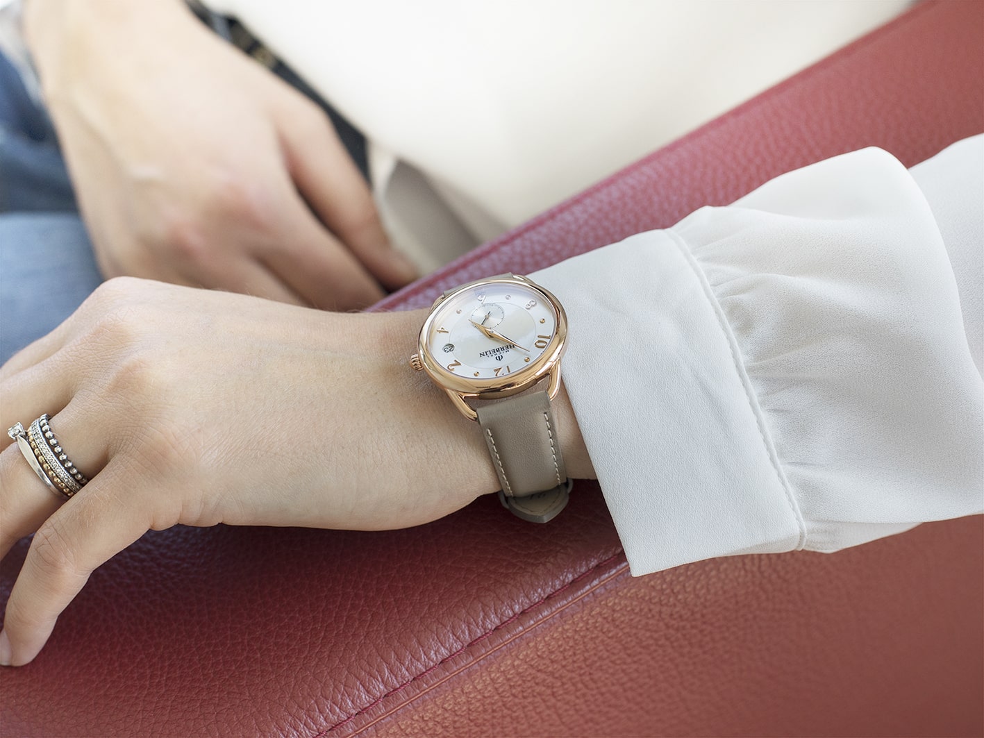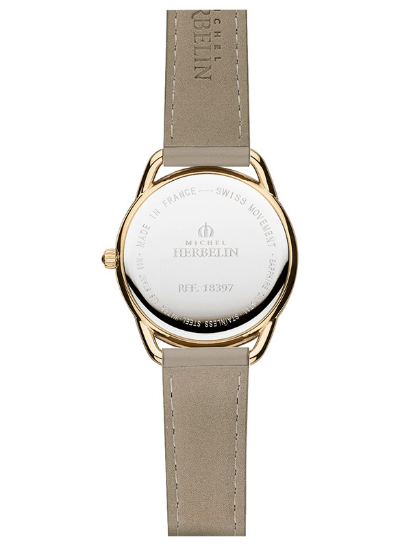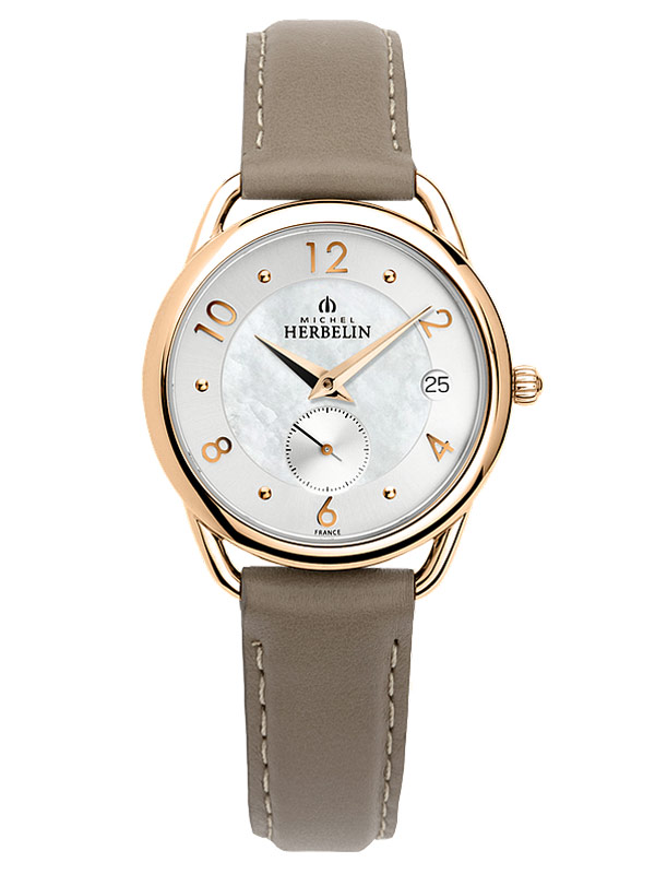 Equinoxe jsou elegantní dámské hodinky francouzské značky Herbelin. Model 18397PR29GR jsou kulaté náramkové hodinky vyrobené z oceli potažené PVD růžovým zlatem s koženým řemínkem. Pod tvrdým a extrémně těžko poškrábatelným safírovým sklíčkem se skrývá světlý ciferník z perleti. Na ciferníku jsou ocelové tečky v místech hodin smíchané s arabskými číslicemi. Na ciferníku je také speciální sekundový subčíselník a funkce data na 3. hodině. Pod číselníkem hodinek se ukrývá švýcarský quartzový Machineek Ronda 6004. Herbelin Equinoxe 18397PR29GR jsou klasické dámské hodinky s šedým koženým řemínkem. Hodinky vypadají na zápěstí skvěle. Díky tenkému psaníčku v kombinaci s koženým páskem se bude jistě nosit pohodlně.