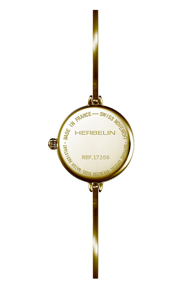 Hodinky Herbelin 17206BP19 z nové kolekce Fil jsou návrhem francouzských šperkařských hodinek, které vynikají především svým náramkem. Pouzdro je vyrobeno z nerezové oceli ve zlaté barvě s PVD povlakem. Na zadní straně pouzdra je ocelové víko. K ouškám pouzdra byl připevněn tuhý pozlacený šperkový náramek. Pod tvrdým safírovým sklíčkem odolným proti poškrábání je minimalistický krásný perleťový ciferník. Ciferník obsahuje čtyři jemné lineární indexy a ostré pozlacené ručičky. Prostor se našel i pro hrdé logo značky Herbelin.