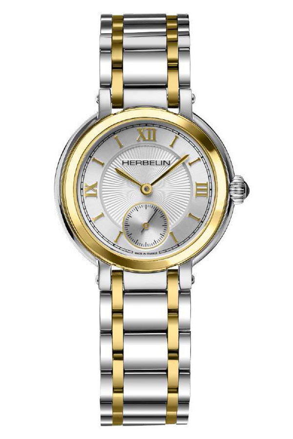 Elegantní dámské hodinky francouzské značky Herbelin Galet 10630/BT28 v klasickém stylu. Psaníčko o tloušťce pouhých 6,5 mm v kombinaci s náramkem, který se velmi příjemně nosí. Prsten na pouzdře a články náramku jsou pozlaceny zlatým PVD povlakem . Ocelový náramek stříbrné barvy s pozlacenými spoji má bezpečné motýlkové zapínání. Ciferník s gilošovaným středem ve stříbrné barvě s římskými číslicemi a lineárními indexy a druhým subciferníkem na šesté hodině kryje extrémně tvrdé a těžko poškrábatelné safírové sklíčko. Srdcem hodinek je quartzový Machineek Ronda 1069 napájený baterií. Vodotěsnost do 50 metrů (5 ATM), umožňuje bezpečné koupání a plavání s hodinkami na zápěstí. Hodinky jsou nabídkou pro ženu, která ocení eleganci a nadčasový šik. Herbelin Galet 10630/BT28 jsou jemné elegantní hodinky, které se budou jistě skvěle vyjímat na zápěstí každé ženy.