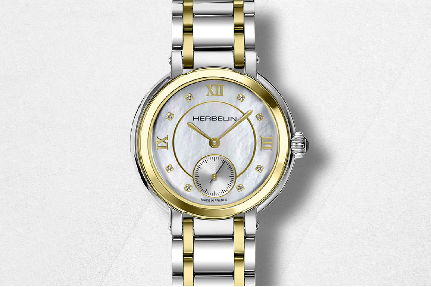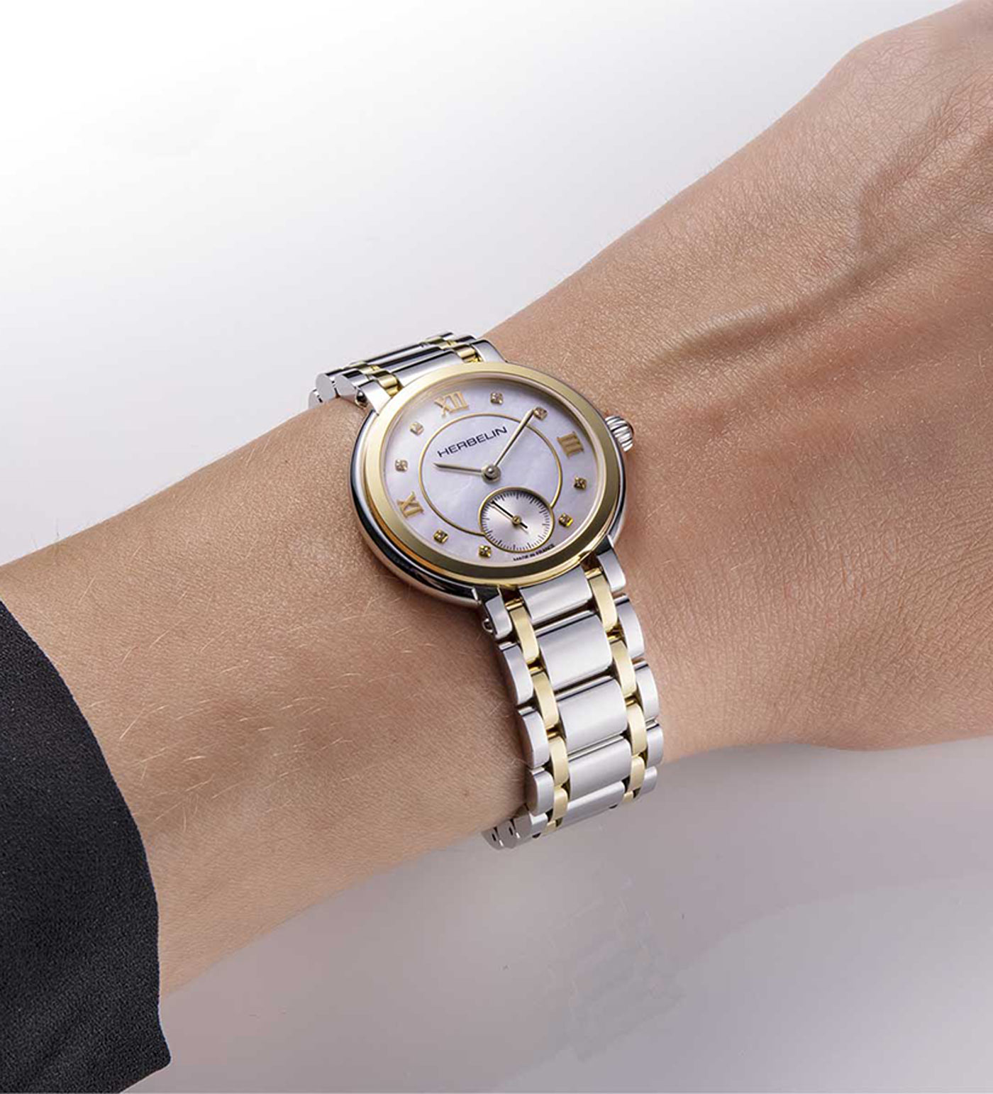 Elegantní dámské hodinky francouzské značky Herbelin Galet 10630/BT59 v klasickém stylu. Psaníčko o tloušťce pouhých 6,5 mm v kombinaci s náramkem, který se velmi příjemně nosí. Prsten na pouzdře a články náramku jsou pozlaceny zlatým PVD povlakem . Perleťový ciferník s římskými číslicemi a kubickými zirkony byl obohacen o subciferník vteřinové ručičky na pozici šestky a vše kryje extrémně tvrdé a těžko poškrábatelné safírové sklíčko. Srdcem hodinek je quartzový Machineek Ronda 1069 napájený baterií. Vodotěsnost do 50 metrů (5 ATM), umožňuje bezpečné koupání a plavání na hladině s hodinkami na zápěstí. Hodinky jsou nabídkou pro ženu, která ocení eleganci a nadčasový šik. Hodinky 10630/BT59 budou jistě skvěle vypadat na zápěstí každé ženy. Pohodlí při používání hodinek zajistí lehký náramek a tenké pouzdro.