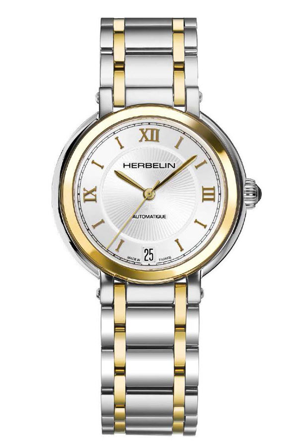Elegantní dámské hodinky francouzské značky Herbelin Galet 1630/BT28 v klasickém stylu. Pouzdro má tloušťku pouhých 9,5 mm v kombinaci s náramkem, který se velmi příjemně nosí.Na pouzdře najdeme PVD pozlacený prsten, který hodinky krásně zdobí. Náramek s pozlacenými články se perfektně hodí k pouzdru hodinek. Ciferník stříbrné barvy s římskými číslicemi a lineárními indexy a datumovkou na pozici šesté hodiny kryje extrémně tvrdé a těžko poškrábatelné safírové sklíčko. Srdcem hodinek je přesný a osvědčený automatický Machineek Sellita W200-1. Vodotěsnost do 50 metrů (5 ATM), umožňuje bezpečné koupání a plavání s hodinkami na zápěstí. Hodinky jsou nabídkou pro ženu, která ocení eleganci a nadčasový šik.
