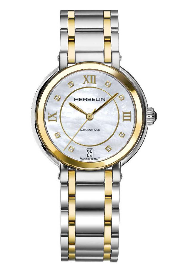 Elegantní dámské hodinky francouzské značky Herbelin Galet 1630/BT59 v klasickém stylu. Psaníčko o tloušťce pouhých 9,5 mm v kombinaci s náramkem, který se velmi příjemně nosí. Na pouzdře najdeme pozlacený PVD prsten, který hodinky krásně zdobí. K pouzdru byl připevněn náramek také ve dvou barvách, dokonale ladící s pouzdrem hodinek. Perlový ciferník s římskými číslicemi a kubickými zirkony byl obohacen o datumové okénko na pozici šesté hodiny. Ciferník je krytý extrémně tvrdým safírovým sklíčkem odolným proti poškrábání. Srdcem hodinek je mimořádně účinný a osvědčený automatický Machineek Sellita W200-1. Vodotěsnost do 50 metrů (5 ATM), umožňuje bezpečné koupání a plavání s hodinkami na zápěstí. Hodinky jsou nabídkou pro ženu, která ocení eleganci a nadčasový šik.
