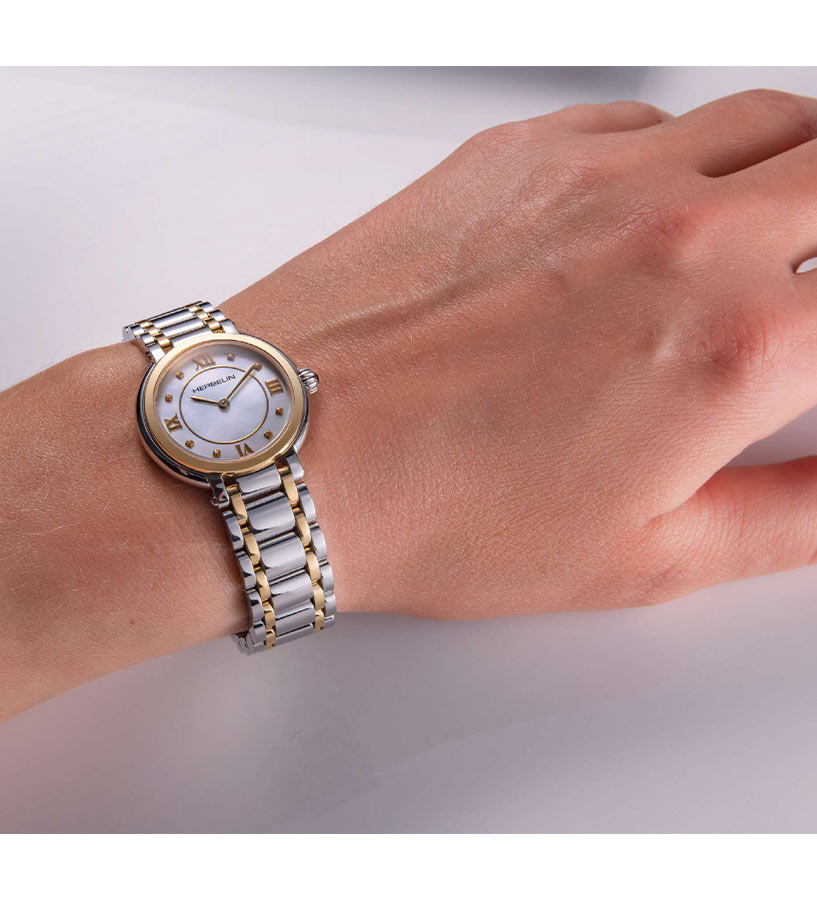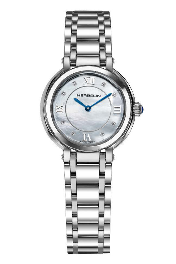 Elegantní, jemné a drobné dámské hodinky francouzské značky Herbelin Galet 17430/B59 v klasickém stylu. Psaníčko o tloušťce pouhých 6,5 mm v kombinaci s náramkem, který se velmi příjemně nosí. Nádherný perleťový ciferník s římskými číslicemi a zirkony je krytý extrémně tvrdým a těžko poškrábatelným safírovým sklíčkem. Srdcem hodinek je efektní a osvědčený quartz Machineek Ronda 751 napájený baterií. Vodotěsnost do 50 metrů (5 ATM), umožňuje bezpečné koupání a plavání s hodinkami na zápěstí. Hodinky jsou nabídkou pro ženu, která ocení eleganci a nadčasový šik.