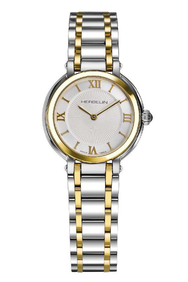 Elegantní, jemné a drobné dámské hodinky francouzské značky Herbelin Galet 17430/BT28 v klasickém stylu. Pouzdro s pozlaceným prstenem o tloušťce pouhých 6,5 mm je kombinováno s náramkem, který se velmi příjemně nosí. Náramek je dvoubarevný stříbrný s přídavkem zlacení s PVD povlakem, který zároveň náramek zpevňuje. Guilloché ciferník s římskými číslicemi a zirkony je krytý extrémně tvrdým a těžko poškrábatelným safírovým sklem. Srdcem hodinek je efektní a osvědčený quartz Machineek Ronda 751 napájený baterií. Vodotěsnost do 50 metrů (5 ATM), umožňuje bezpečné koupání a plavání s hodinkami na zápěstí. Hodinky jsou nabídkou pro ženu, která ocení eleganci a nadčasový šik. Hodinky 17430/BT28 jsou návrhem hodinek, které budou vypadat skvěle na zápěstí každé ženy. Tenké pouzdro a lehký náramek zajistí pohodlí při používání těchto náramkových hodinek. V zástupu ostatních klasických modelů jistě zaujme krásný gilošovaný ciferník s doplněním zirkonových kamenů.