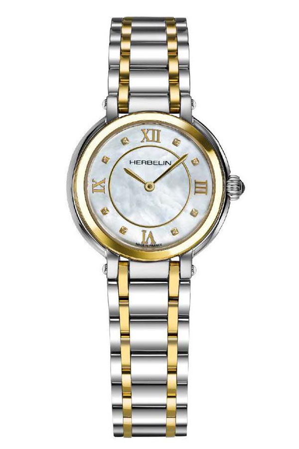 Elegantní, jemné a drobné dámské hodinky francouzské značky Herbelin Galet 17430/BT59 v klasickém stylu. Pouzdro s pozlaceným prstenem o tloušťce pouhých 6,5 mm je navíc kombinováno s pozlaceným náramkem, který se velmi příjemně nosí. Perleťový ciferník s římskými číslicemi a kubickými zirkony je pokryt extrémně tvrdým a těžko poškrábatelným safírovým sklem. Srdcem hodinek je efektní a osvědčený quartz Machineek Ronda 751 napájený baterií. Vodotěsnost do 50 metrů (5 ATM), umožňuje bezpečné koupání a plavání s hodinkami na zápěstí. Hodinky jsou nabídkou pro ženu, která ocení eleganci a nadčasový šik. Hodinky 17430/BT59 jsou návrhem hodinek, které budou vypadat skvěle na zápěstí každé ženy. Tenké pouzdro a lehký náramek zajistí pohodlí při používání těchto náramkových hodinek. Nádherný perleťový ciferník s přídavkem zirkonových kamenů jistě zaujme v zástupu ostatních klasických modelů.