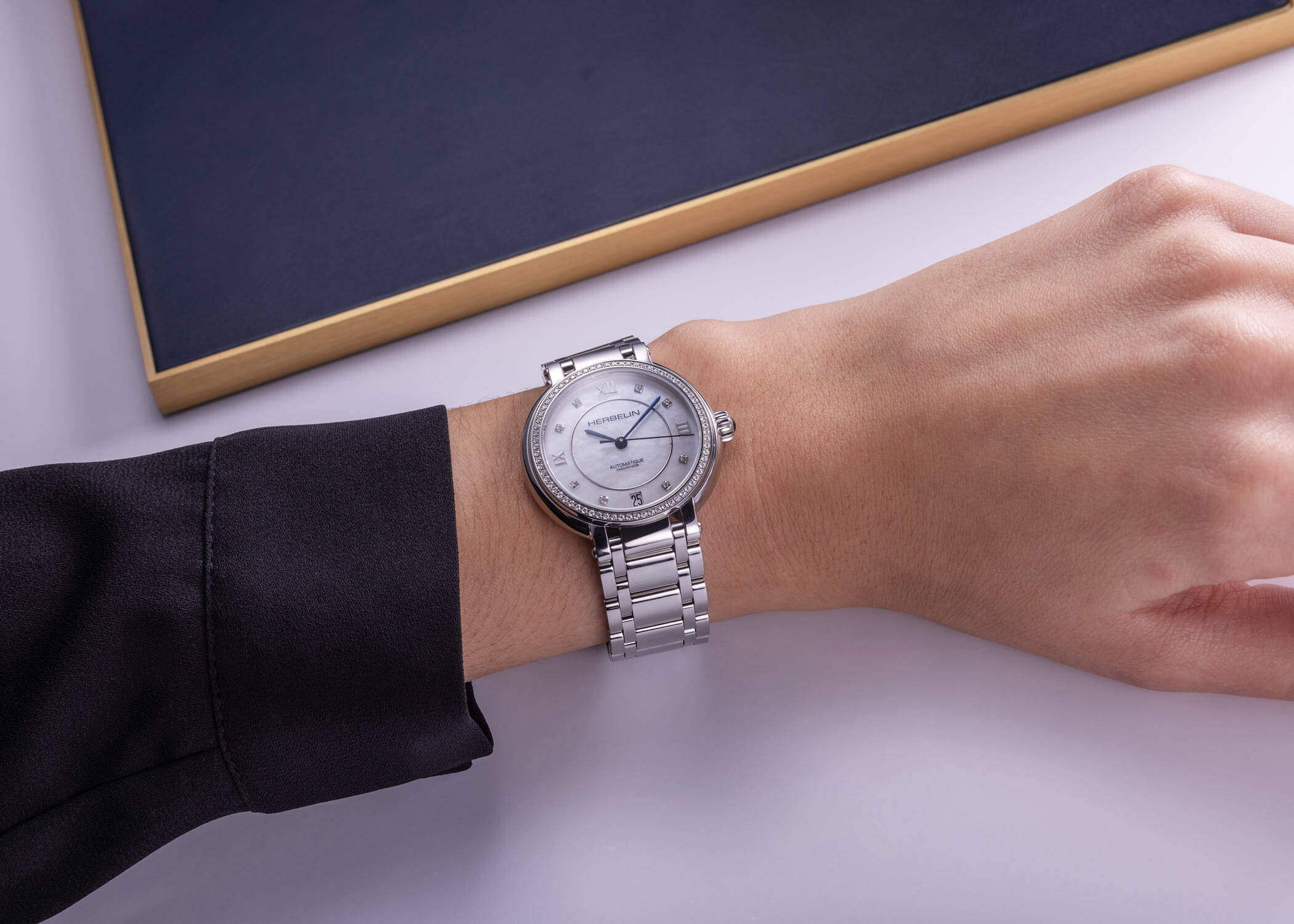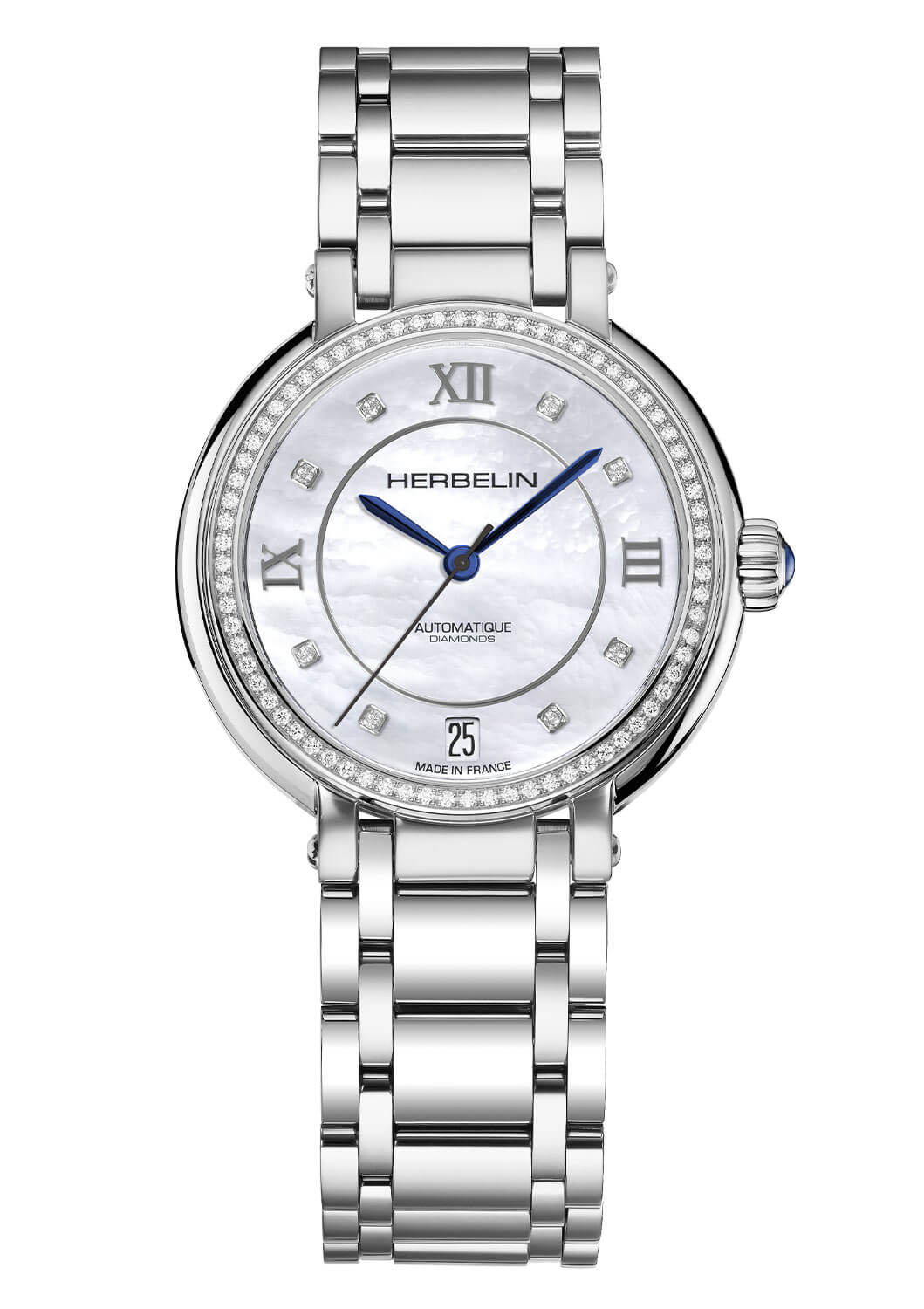 Ciferník automatických hodinek Herbelin 1630B72Y89 vyrobený z přírodní bílé perleti je obohacen o diamantové indexy na celých hodinách a také precizně aplikované římské číslice, které dodávají eleganci a třídu. Modré ocelové hodinové a minutové ručky dodávají jemný, ale rafinovaný nádech barvy, zatímco lakovaná černá vteřinová ručka podtrhuje vynikající přesnost hodinek. Srdcem těchto hodinek je švýcarský automatický strojek, který zajišťuje spolehlivou přesnost a jeho přibližně 40hodinová rezerva chodu zaručuje neochvějnou funkčnost po dlouhou dobu.