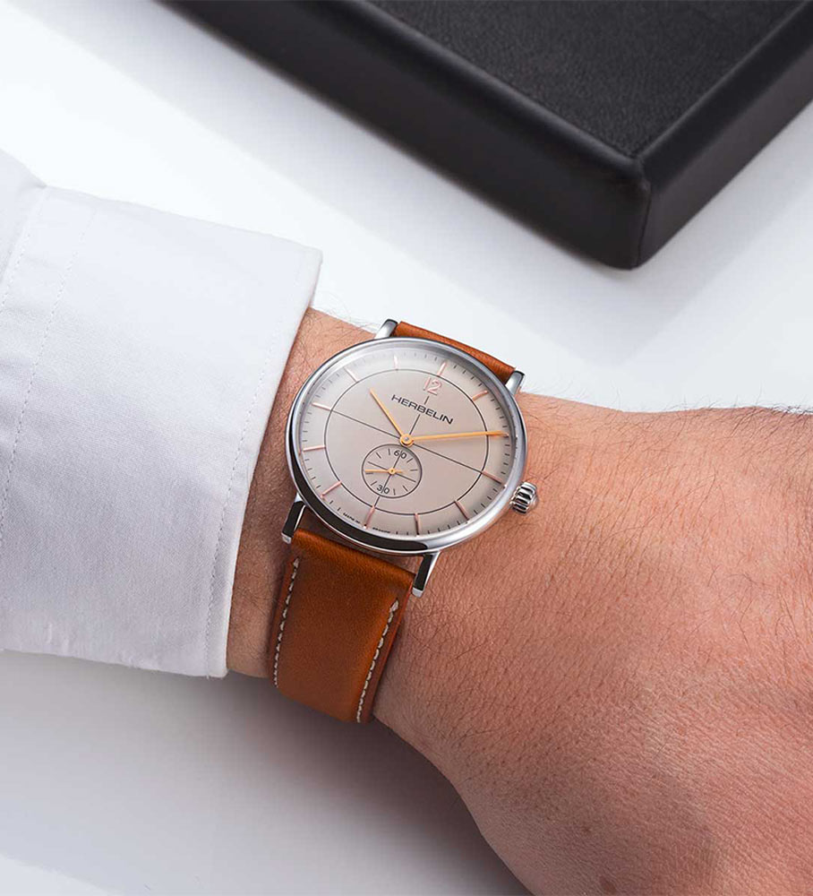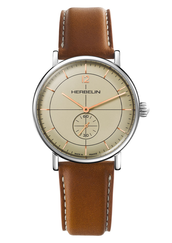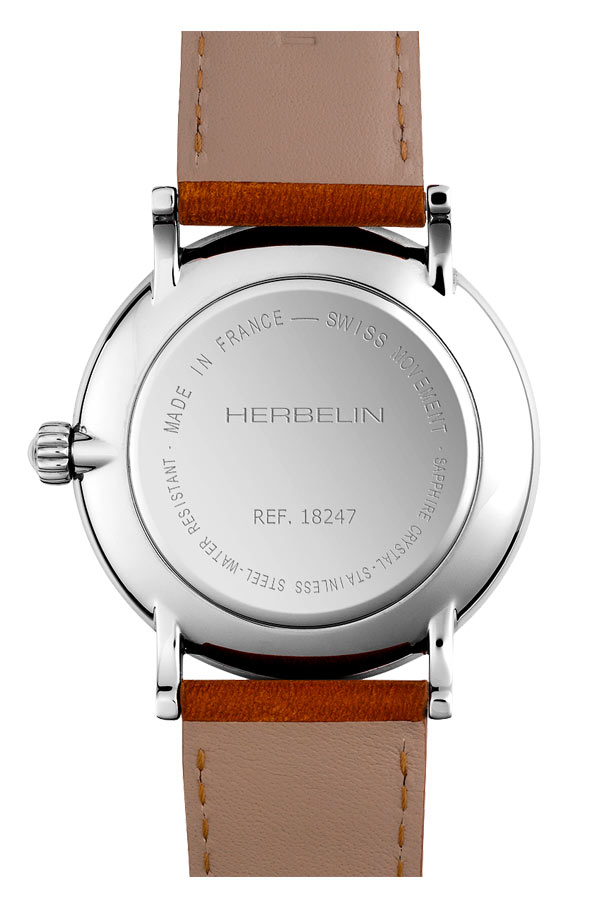 Herbelin z kolekce Inspiration jsou hodinky vytvořené v retro stylu. Referenční číslo 18247/AP17TRGD se vyznačuje kulatým ocelovým pouzdrem a hnědým koženým řemínkem připevněným k okům. Pod safírovým sklíčkem, které je extrémně těžké poškrábat, najdeme světlý ciferník s lineárními indexy a arabskou číslicí na dvanácté hodině. Na šesté hodině najdeme subčíselník vteřinové ručičky. Tento pánský model má Machineek quartz, který zajišťuje velmi dobré měření času. Voděodolnost 3ATM umožňuje bezpečné mytí rukou s časovačem na zápěstí.