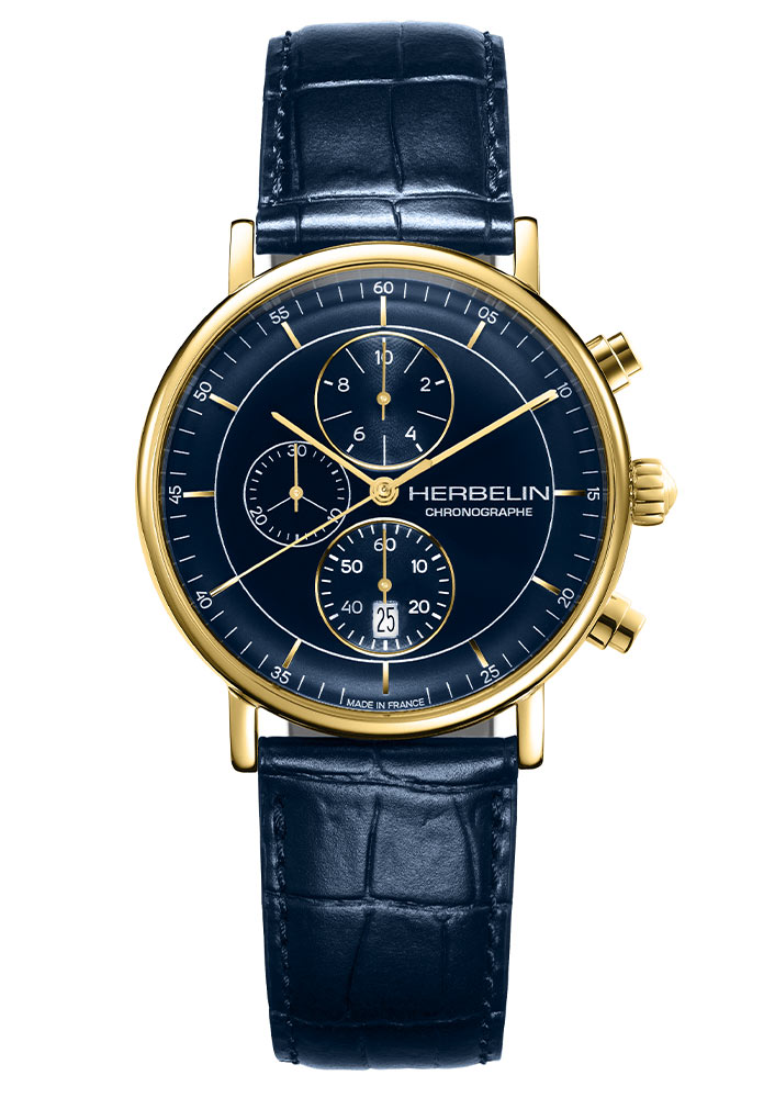Ciferník v intenzivní modré barvě získává eleganci a originalitu. Pod safírovým sklíčkem odolným proti poškrábání jsou vidět precizně vyrobené lineární indexy. Dvanáctou hodinu doplňuje arabská číslice. Aktuální čas ukazují štíhlé, pozlacené ručičky. Subciferník umístěný na šesté hodině je vteřinová ručička, která hodinkám dodává dynamiku a retro charakter. Tento model byl obohacen o funkci chronografu, která umožňuje rychle měřit přesný čas. Quartzový mechanismus, který tyto hodinky pohání, zaručuje spolehlivost a velmi dobré měření času.
