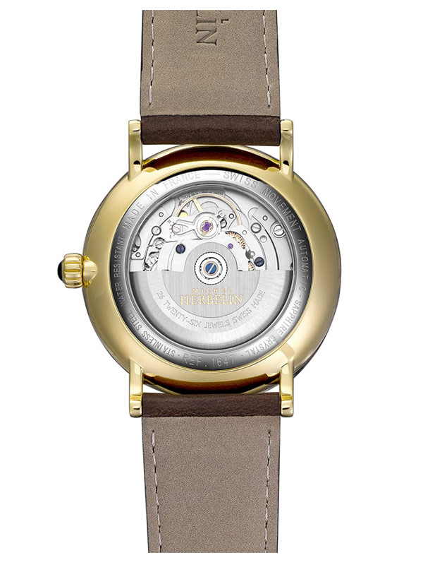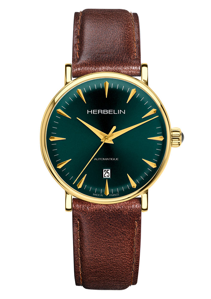 Kolekce Inspiration , kterou vytvořila francouzská značka Herbelin , vycházela z historického modelu z 50. let minulého století, který navrhl sám zakladatel společnosti. Doménou této designové řady je nadčasovost, retro styl a jemnost do nejmenších detailů. Model 1647P16BR se vyznačuje elegantním zeleným ciferníkem s pozlacenými indexy. Číselník navíc zdobí radiální výbrus, který na jeho povrchu vytváří pěkné odlesky od dopadajícího světla. Hodinové značky ve tvaru slzy a jemné ručičky spolu dobře ladí. Z ciferníku můžeme kromě aktuálního času odečíst i den v měsíci. Okénko tohoto indikátoru je blízko 6 hodin. Urostlé ocelové pouzdro o průměru 40 mm je pozlaceno žlutým zlatem. Pouzdro má třídu voděodolnosti 30 metrů. Z horní strany ji uzavírá vypouklé safírové sklíčko s antireflexní vrstvou. Mechanismus, který dává ruce do pohybu, je Sellita SW200-1 s chodem 4 Hz a rezervou chodu 38 hodin. Napětí se provádí pohybem ruky. Vintage styl dokonale podtrhne hnědý řemínek s hladkou strukturou. Byl vyroben z vysoce kvalitní teletiny a má tradiční přezku.