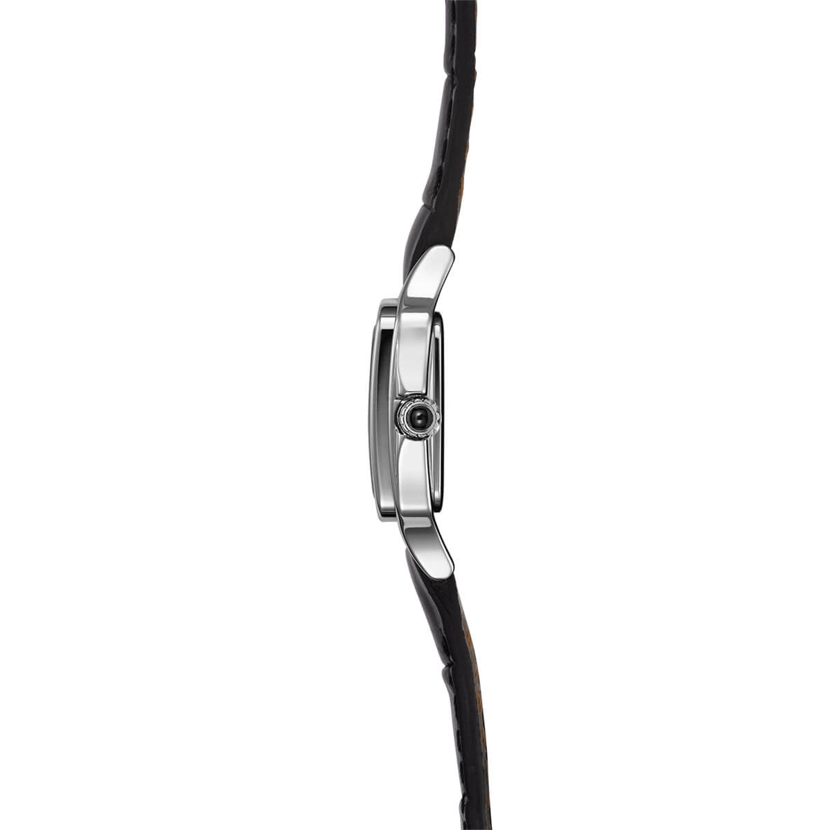 Štíhlé pouzdro o rozměrech 18.60 × 20 mm je vyrobeno z odolné ušlechtilé oceli 316L, jejíž elegantní saténová úprava podtrhuje nadčasový charakter. Je doplněno černým řemínkem z přírodní kůže – měkkým, ale výrazným akcentem. Safírové sklíčko chrání ciferník před poškrábáním a zajišťuje, že hodinky si uchovají svůj půvab i při intenzivním používání.