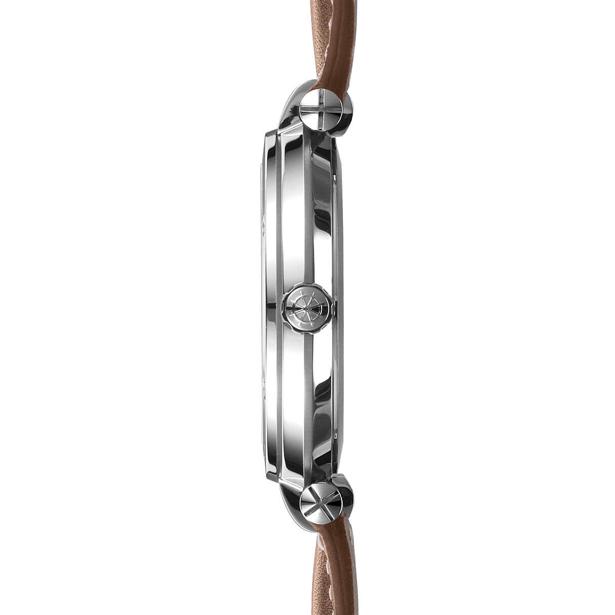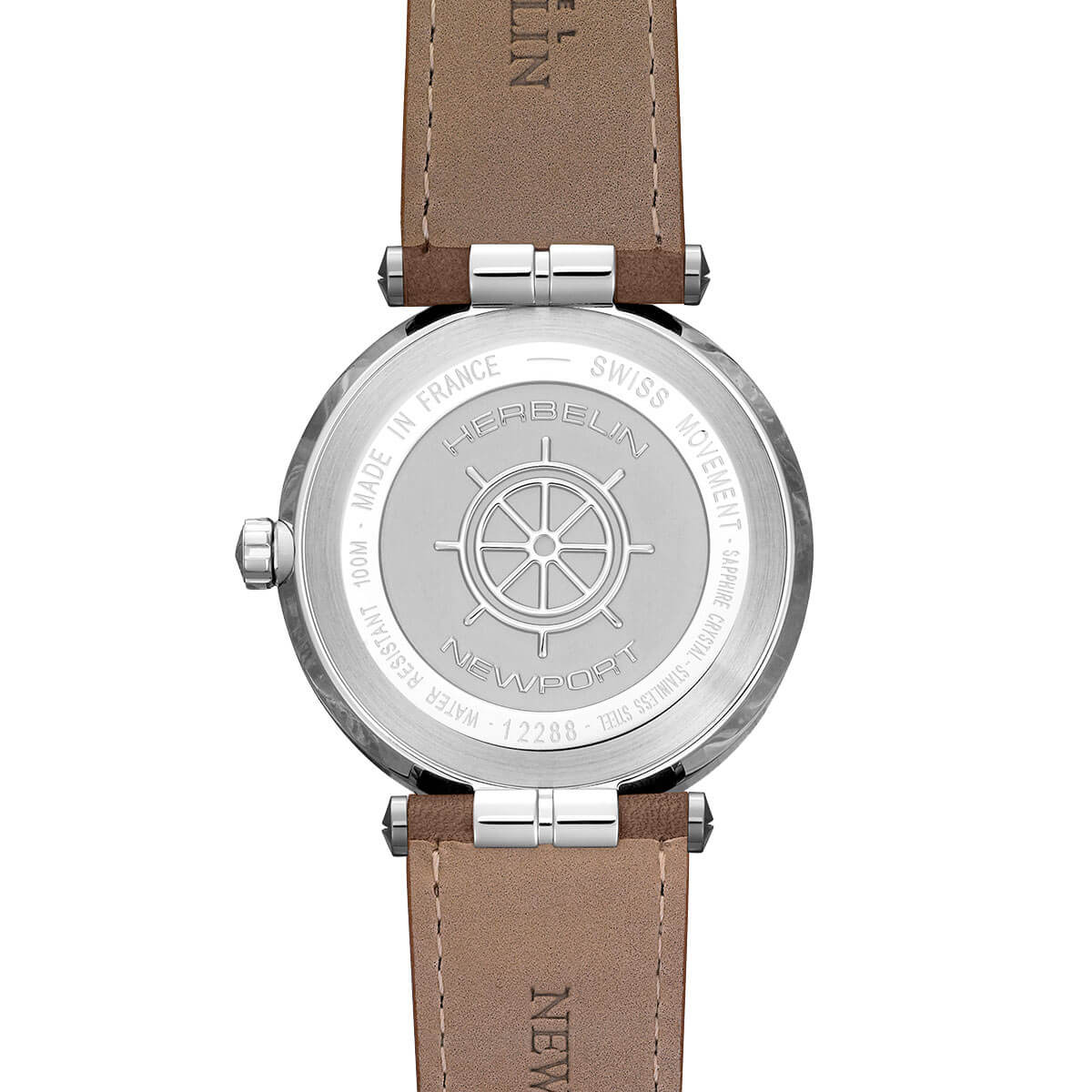Tenké pouzdro o tloušťce pouhých 8,35 mm a průměru 40,50 mm je vyrobeno z korozivzdorné ušlechtilé oceli a na spodní straně jej zdobí gravírované kormidlo – podpis námořního dědictví řady Newport. Safírové sklíčko chrání ciferník před poškrábáním a vodotěsnost do 100 metrů poskytuje jistotu v každodenních situacích – ať už jste v kanceláři, na procházce nebo u vody.