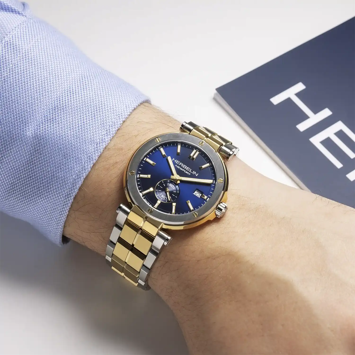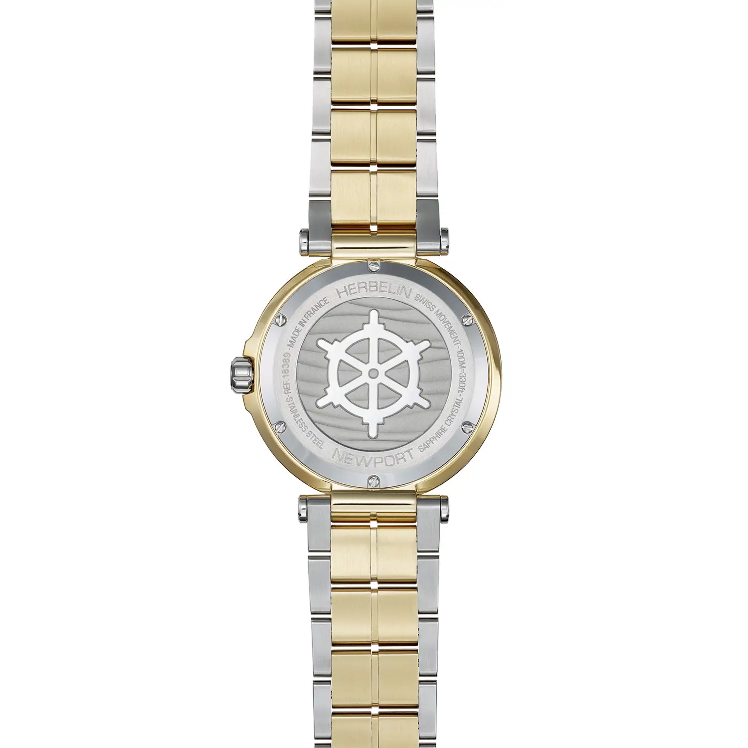 Pánské hodinky Herbelin Newport 18389BT1N35 jsou kvintesencí francouzského stylu, který přenáší estetiku prestižních regat přímo na mužské zápěstí. Nejcharakterističtějším prvkem této verze je solidní, třířadý náramek vyrobený v technologii bicolore. Spojení broušené ušlechtilé oceli s leštěnými články pokrytými zlatem PVD vytváří soudržnou kompozici s pouzdrem a dodává celku šperkařský nádech. Výrazné uchycení náramku k pouzdru pomocí centrálních nožek je poznávacím znakem kolekce Newport a odkazuje na tradiční upevnění lan na luxusních jachtách.