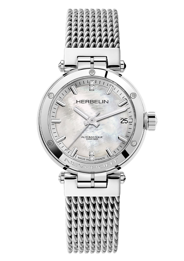 Klasické dámské hodinky v jachtařském stylu francouzské značky Herbelin Newport Automatic 1658AP89B, které následují sportovního ducha. Kulaté pouzdro z nerezové oceli ve stříbrné barvě. Stříbrný ocelový náramek MESH. Safírové sklíčko s bílým perleťovým ciferníkem osázeným luxusními diamanty na pozici 12. a 6. hodiny. Fluorescenční lineární indexy a ručičky vám pomohou odečíst čas ve tmě. Srdcem hodinek je automatický Machineek ETA 2824-2 s rezervou chodu 38 hodin. Herbelin Newport Automatic 1658AP89B je krásný ženský doplněk, který v davu klasických hodinek jistě zaujme. Díky jemnému náramku se budou hodinky Herbelin 1658/89B používat lehce a příjemně. Přírůstek v podobě diamantů jistě potěší oko každého uživatele.