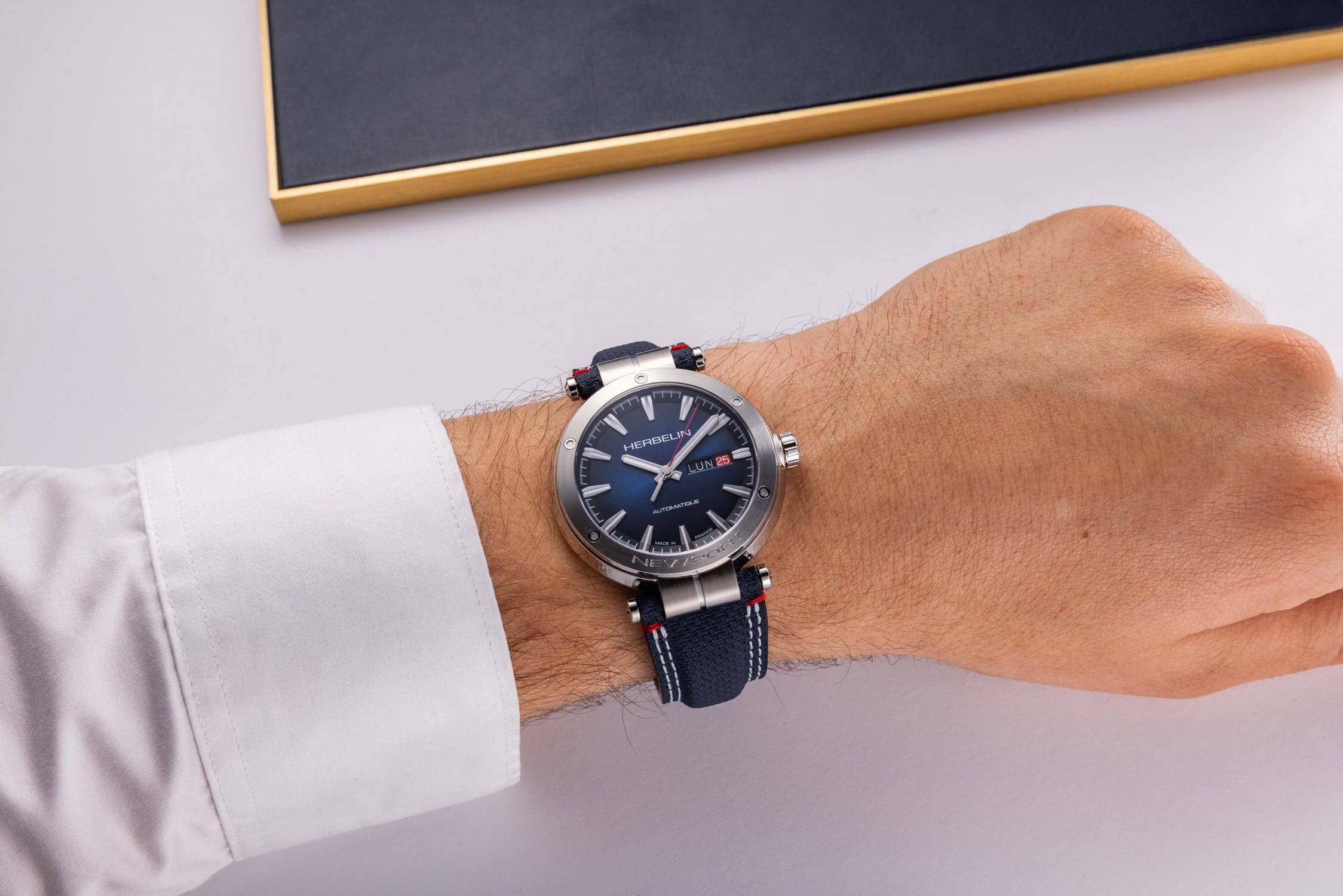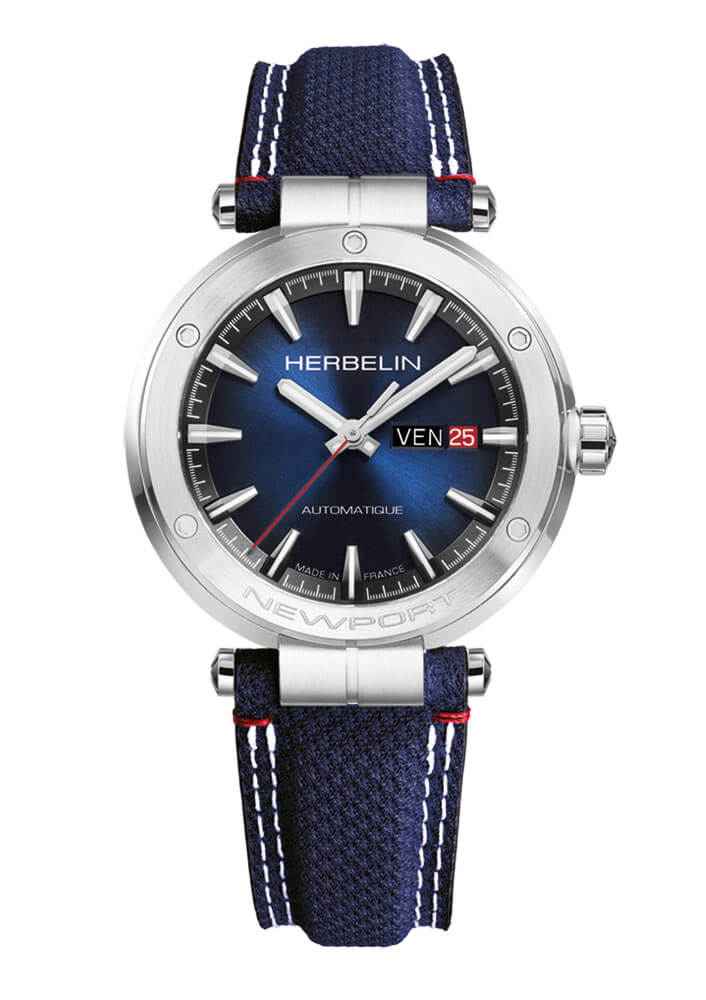 Na číselníku dominuje hluboký odstín modré s efektem sunburst, který – jako vodní hladina – mění barvu v závislosti na úhlu dopadajícího světla. Leštěné indexy, luminiscenční ručky a červená vteřinová ručička podtrhují moderní, sportovní charakter hodinek a ukazatel dne a data zvyšuje jejich praktičnost. Celek pohání přesný automatický strojek Sellita SW220-1 Swiss Made, jehož spolehlivý chod je ukryt pod safírovým sklem. Hodinky Herbelin Newport Automatic 1768A15BL na textilním řemínku představují harmonii stylu a techniky v námořním duchu.