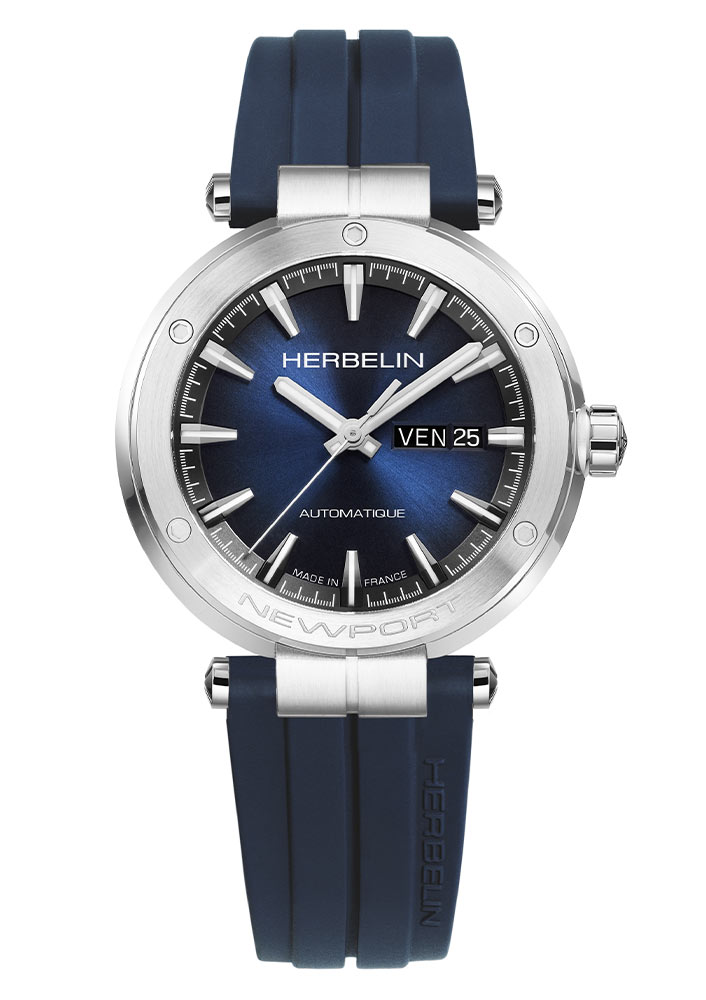 Automatické pánské hodinky v námořním stylu francouzské značky Herbelin Newport Automatique 1768A15CB . Stříbrné pouzdro z nerezové oceli s průhlednou zadní stranou pouzdra, přes které je vidět krásně zdobený automatický Machineek. Modrý voděodolný gumový pásek. Modrý ciferník s lineárními indexy obohacený o luminiscenční látky v indexech a ručkách. Rozšířené okno s datem ve 3 hodiny zobrazující číslo dne v měsíci a název dne v týdnu. Automatický Machineek Sellita SW220-1 zdobený modrými šrouby. Herbelin 1768A15CB je sportovní model, který lze kombinovat i s elegantní košilí. Díky pohodlnému gumovému pásku se budou hodinky nosit lehce a příjemně. Automatický mechanismus zajistí dokonalé měření času během používání hodinek.