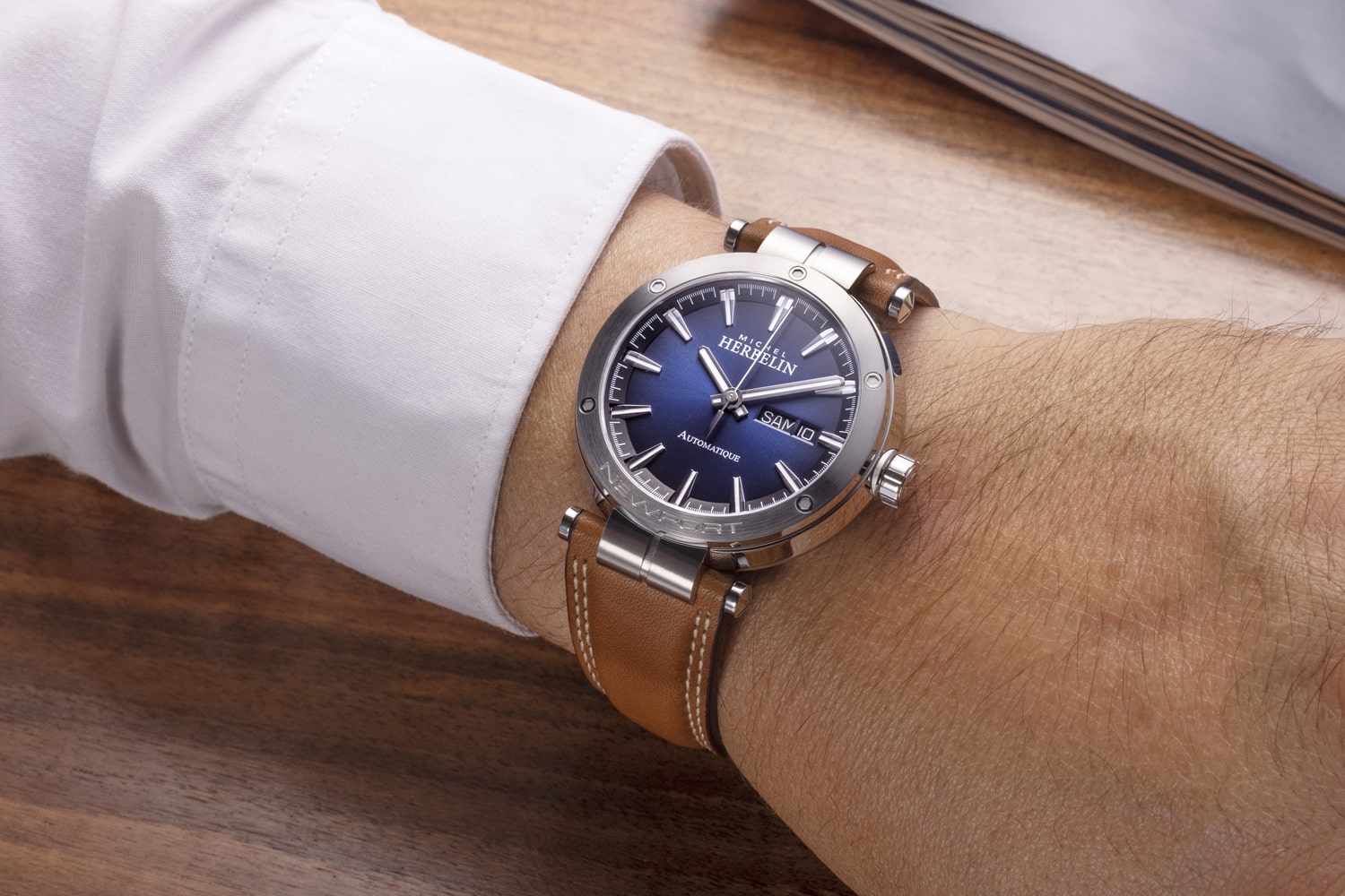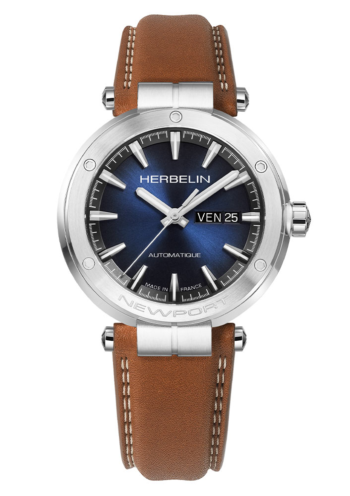 Automatické pánské hodinky v námořním stylu francouzské značky Herbelin Newport Automatique 1768A15GD . Stříbrné pouzdro z nerezové oceli s průhlednou zadní stranou pouzdra, přes které je vidět krásně zdobený automatický Machineek. Hnědý kožený řemínek s jemným dvojitým prošíváním. Modrý ciferník s lineárními indexy obohacený o luminiscenční látky v indexech a ručkách. Rozšířené okno s datem ve 3 hodiny zobrazující číslo dne v měsíci a název dne v týdnu. Automatický Machineek Sellita SW220-1 zdobený modrými šrouby. Díky koženému řemínku, který perfektně zapadá do oček pouzdra, umožní pohodlné a příjemné používání hodinek na zápěstí. Čistý a třpytivý číselník vám umožní snadno a rychle odečíst aktuální čas. Automatické hodinky Herbelin 1768A15GD na zápěstí vypadá perfektně.